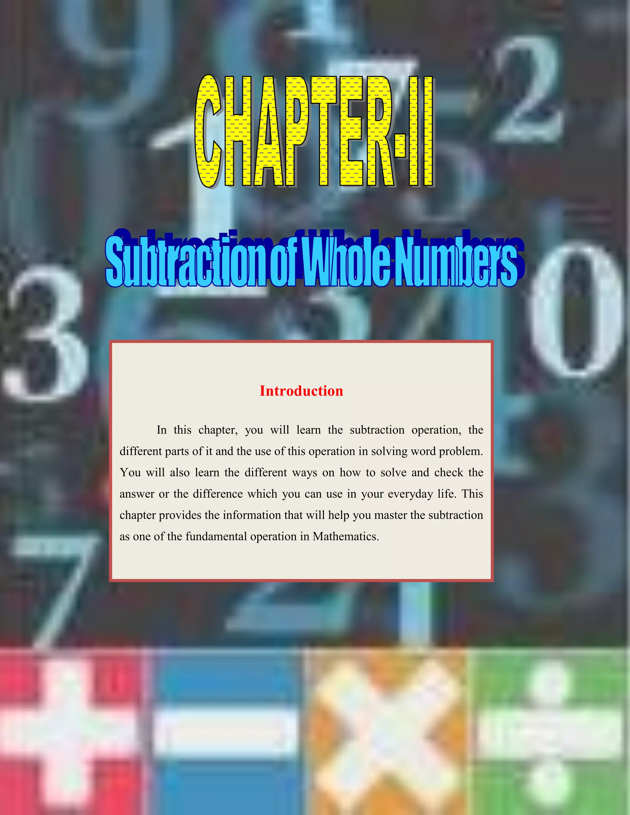 Subtraction is a fundamental mathematical operation that is used to find the difference between two numbers. It involves identifying the minuend, subtrahend, and difference. Word problems can also be solved using subtraction to determine unknown values.