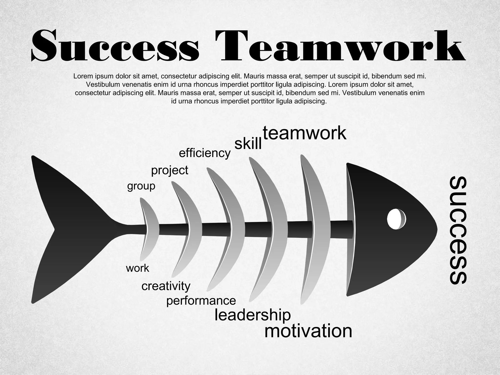 The document discusses the importance of teamwork and motivation in achieving project success, emphasizing efficiency and leadership skills. It mentions the fishbone diagram as a tool for analyzing problems and improving group work dynamics. The recurring theme highlights principles such as creativity and effective group collaboration.