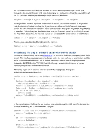 The document describes the Visual C++ Project Model, detailing its structure, functionalities, and interfaces for managing project elements within the Visual Studio environment. It elaborates on enumerating projects, accessing project properties, and managing configurations through automation interfaces. The document emphasizes the complexities of handling user-defined project types and the importance of unique identifiers in avoiding conflicts.