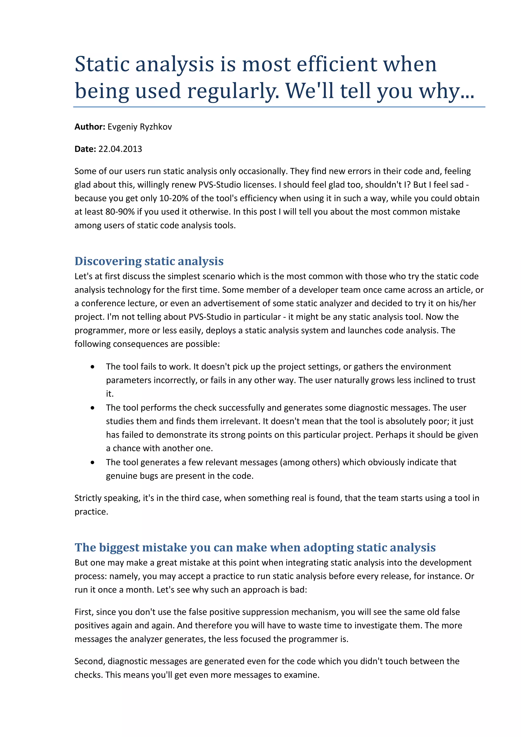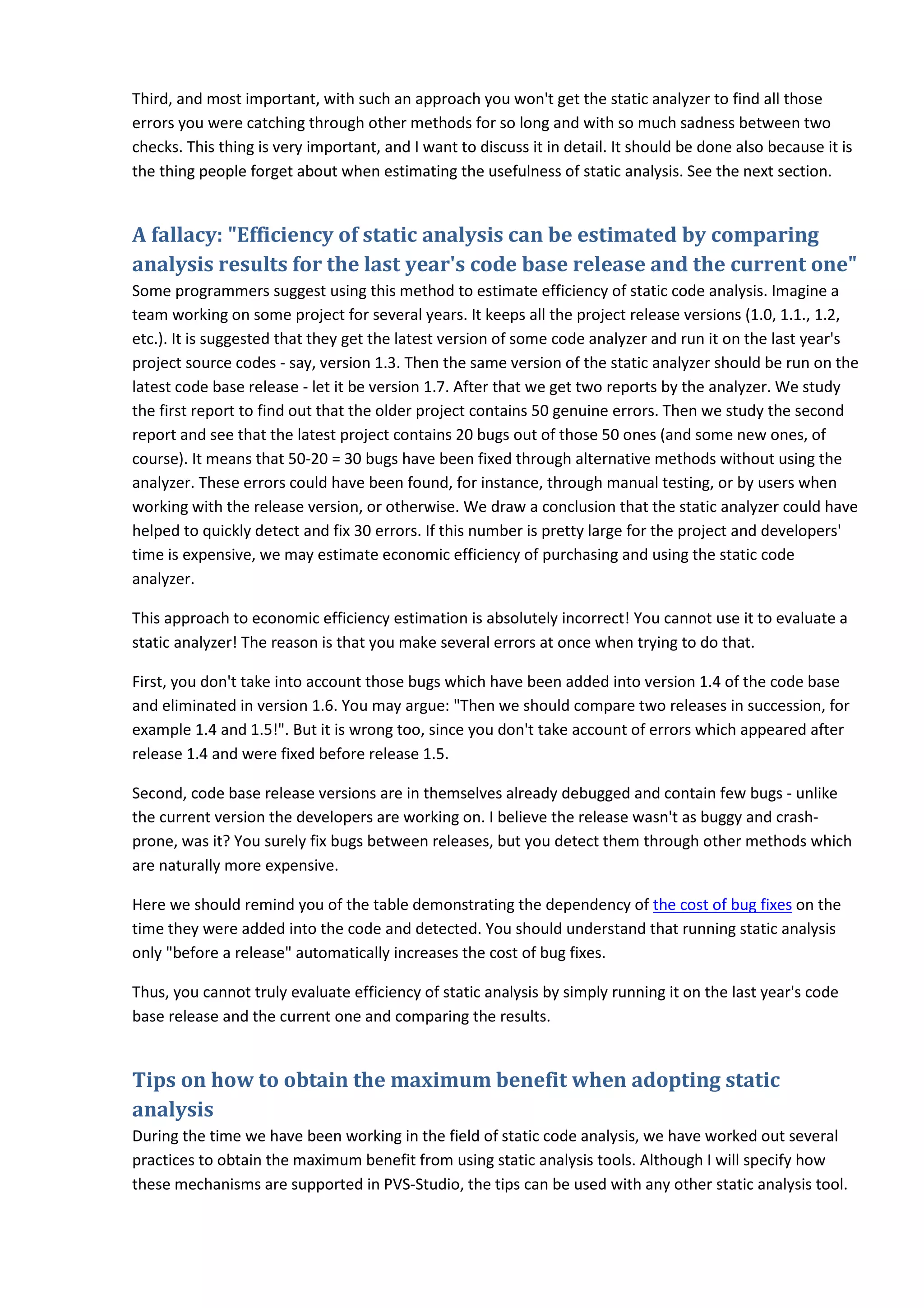The document discusses best practices for using static code analysis tools to maximize their effectiveness. It recommends: 1) Marking false positives to reduce future messages, 2) Using incremental analysis to check modified files, 3) Checking files modified in the last few days, and 4) Running analysis nightly on a build server. Following all recommendations provides the highest return on investment in static analysis by catching errors earlier in development.