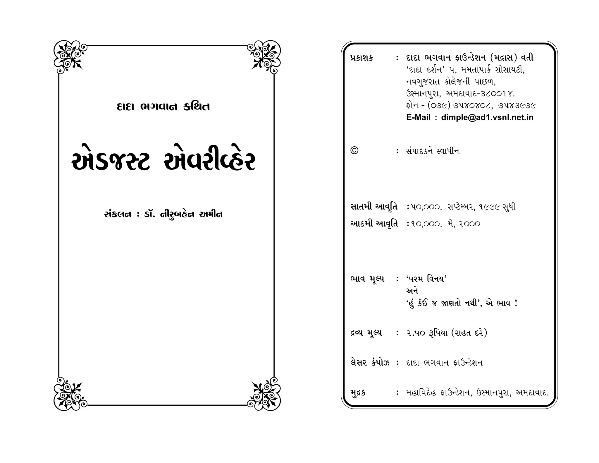 25 ÿÎÿÎfi_ ±Ω›⁄ ωiÎÎfi !! ≠΄M÷V◊Îfi ≠ë¿÷ν — “±ıÕ…VÀ‹ıLÀ”fiÌ ‰Î÷ »ı, ±ıfiÌ ’λ‚ ¤Î‰ Â_ »ı ? ‹_⁄¥ — ÕΘ. fiÌv⁄Ëıfi ±‹Ìfi ’»Ì @›Î_ Á‘Ì ±ıÕ…VÀ‹ıLÀ‹Î_ ±Î‰‰_ ? 904/⁄Ì, fi‰Ìfi±ÎÂÎ ±ı’ÎÀÛ‹ıLÀ, ÿÎÿÎÁÎËı⁄ ŒÎ‚¿ı fl˘Õ, ÿÎÿfl (Áı.flı.), ‹_⁄¥-400014 ÿÎÿÎlÌ — ¤Î‰ ÂÎ_Ï÷fi˘ »ı, ÂÎ_Ï÷fi˘ Ëı÷ »ı. ±ÂÎ_Ï÷ µI’Lfi Œ˘fi — (022) 4137616, Pager : 9602-117283 fiËŸ ¿fl‰Îfi˘ ¿ÌÏ‹›˘ »ı. “ÿÎÿΔfi_ “±ıÕ…VÀ‹ıLÀ”fi_ ωiÎÎfi »ı. ±Ω›⁄ ±‹ÿΉÎÿ — lÌ ÿÌ’¿¤Î¥ ÿıÁÎ¥ “±ıÕ…VÀ‹ıLÀ” »ı ±Î ±fiı F›Î_ “±ıÕ…VÀ” fiËŸ ◊Λ I›Î_ ÷ıfi˘ V‰Îÿ 1, ‰wHÎ ±ı’ÎÀÛ‹ıLÀ, 37, lÌ‹Î‚Ì Á˘ÁΛÀÌ, ÷˘ ±Î‰÷˘ … ËÂı fiı ÷‹fiı ?! ±Î “ÏÕÁ˚±ıÕ…VÀ‹ıLÀ” ±ı … ‹Ò¬Î˝¥ fi‰fl_√’flÎ, ±‹ÿΉÎÿ-380009. »ı. “±ıÕ…VÀ‹ıLÀ”fiı ±‹ı L›Î› ¿Ë̱ı »Ì±ı. ±Î√˛Ë-ÿÒflÎ√˛Ë ±ı ¿o¥ Œ˘fi — (079) 6421154, 463485 Œı@Á — 408528 L›Î› fiÎ ¿Ëı‰Î›. ¿˘¥ ’HÎ Ω÷fi˘ ±Î√˛Ë ±ı L›Î› fi◊Ì. ±‹ı E-Mail : dimple@ad1.vsnl.net.in ¿ÂÎfi˘ ¿y˘ fiÎ ’¿Õ̱ı. …ı ’ÎHÎ̱ı ‹√ «œı ±ıfiÎ◊Ì «œÎ‰Ì±ı. »ı‰Àı Madras : Dada Bhagwan Foundation √ÀflfiÎ ’ÎHÎ̱ı ’HÎ «œÎ‰Ì±ı !! Ajit C. Patel, No. 9, Manohar Avenue, Egmore, ±I›Îfl Á‘Ì ±ı¿<_› ‹ÎHÎÁ ±‹fiı ÏÕÁ˚±ıÕ…VÀ ◊›˘ fi◊Ì. ±fiı Madras-600008. Tel : (044) 8261243, 8261369 Fax : 8261225 ±Î ·˘¿˘fiı CÎflfiÎ_ «Îfl ‹ÎHÎÁ˘ › ±ıÕ…VÀ ◊÷Î_ fi◊Ì. ±Î ±ıÕ…VÀ U.S.A. : Dada Bhagwan Vignan Institue ◊‰Îfi_ ±Î‰Õı ¿ı fiÎ ±Î‰Õı ? ±ı‰_ ◊¥ ¿ı ¿ı fiÎ ◊¥ ¿ı ? ±Î’HÎı Dr. Bachubhai Patel, …ı‰_ Ωı¥±ı ±ı‰_ ÷˘ ±Î’HÎfiı ±Î‰Õı fiı ? ±Î …√÷fi˘ Ïfi›‹ ¢ 902 SW Mifflin Road, Topeka, Kansas 66606. Tel. : (913) 271-0869 Fax : (913) 271-8641 »ı ¿ı …ı‰_ ÷‹ı Ωı¢ ±ıÀ·_ ÷˘ ±Î‰Õı …. ±ı‹Î_ ¿o¥ Â̬‰‰Î’b_ flËı÷_ Dr. Shirish Patel fi◊Ì. ¿›_ fiÎ ±Î‰Õı ? ¿ı Ë_ ÷‹fiı ±Î‹ …ı µ’ÿı ±ÎM›Î ¿v_ »_ 2659 Raven Circle, Corona, CA 91720 U.S.A. fiı, ÷ı ±Î‰Õı fiËŸ. ’HÎ ‹Îv_ ‰÷˝fi ÷‹ı Ωı¢ ÷˘ ÁËı…ı ±Î‰ÕÌ Ω›. Tel. : (909) 734-4715. Fax : (909) 734-4411 U.K. : Shri Maganbhai Patel ±ËŸ CÎıfl “±ıÕ…VÀ” ◊÷Î_ ±Î‰Õ÷_ fi◊Ì fiı ±ÎI‹iÎÎfifiÎ_ ÂÎVh΢ 2, Winifred Terrace, Enfield, Great Cambridge Road, ‰Î_«‰Î ⁄ıÃΠˢ› ! ±S›Î, ‹ı·fiı ’Ò‚˘ ±ËŸ◊Ì. ’Ëı·_ “±Î” Â̬fiı. London, Middlesex, ENI 1HH U.K. Tel : 181-245-1751 CÎfl‹Î_ “±ıÕ…VÀ” ◊‰Îfi_ ÷˘ ¿Â_ ±Î‰Õ÷_ fi◊Ì. ±Î‰_ »ı ±Î …√÷ ! Mr. Ramesh Patel Á_ÁÎfl‹Î_ ⁄Ì…_ ¿Â_ ¤·ı fiÎ ±Î‰Õı, ¿o¥ ‰Î_‘˘ fi◊Ì. ‘_‘˘ ¿fl÷Î_ 636, Kenton Road, Kenton Harrow, London, Middlesex, HA3 9NR U.K. ±˘»˘ ±Î‰Õı ÷˘ ‰Î_‘˘ fi◊Ì. ’HÎ ±ıÕ…VÀ ◊÷Î_ ±Î‰Õ‰_ Ωı¥±ı. Tel. : 181-204-0746 Fax :181-907-4885 ±ıÀ·ı ‰V÷„V◊Ï÷‹Î_ ±ıÕ…VÀ ◊÷Î_ Â̬‰_ Ωı¥±ı. ±Î ¿Î‚‹Î_ ±ıÕ…VÀ Canada : Shri Suryakant N. Patel ◊÷Î_ fiÎ ±Î‰Õı ÷˘ ‹Î›˘˝ …¥Â. ±ıÀ·ı ¿Î‹ ¿ÎœÌ ·ı‰Î …ı‰_ »ı. 1497, Wilson Ave, Appt.#308, Downsview, Onterio, Toronto. M3M 1K2, CANADA. vvvvv Tel. : (416) 247-8309