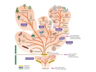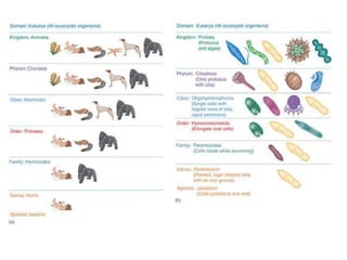 This document discusses the classification of microorganisms. It explains that taxonomy is the formal system for organizing, classifying, and naming living things. Microorganisms are classified based on their domains, kingdoms, and other subgroups. The three domains are Eubacteria, Archaea, and Eukarya. Kingdoms include Protista, Fungi, Plantae, and Animalia. Microorganisms are also classified based on their physical and genetic characteristics. Bergey's Manual is a key resource that uses phylogenetic analysis to classify procaryotes. Major bacterial groups include Proteobacteria, Firmicutes, and Actinobacteria. The document also discusses classification of archaea, eukaryotes like fungi