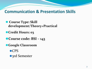 This document outlines the key points of a course on Communication and Presentation Skills. The course is 3 credit hours and covers both theory and practical skills. It includes midterm and final exams worth 20% and 60% respectively, as well as class activities, presentations, and quizzes worth 20%. The course syllabus covers basics of technical communication, oral presentation skills, and group communication. Key concepts discussed include the communication cycle, levels of communication, formal and informal communication networks, and characteristics of language.