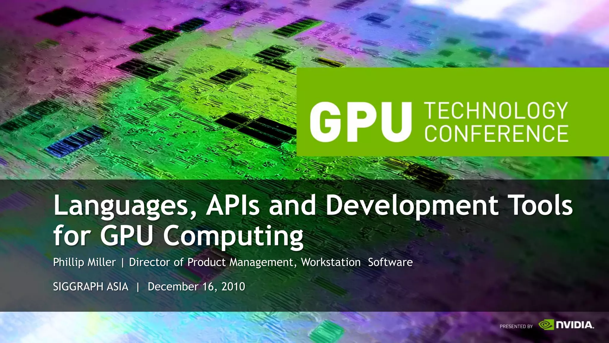 The document discusses GPU computing software and development tools from NVIDIA. It provides an overview of language and API options for GPU computing like CUDA, OpenCL, and DirectCompute. It also describes development tools like the CUDA toolkit, Parallel Nsight debugger, and Visual Profiler for optimizing GPU applications. Foundation libraries and common design patterns are also covered to help developers leverage GPUs effectively.