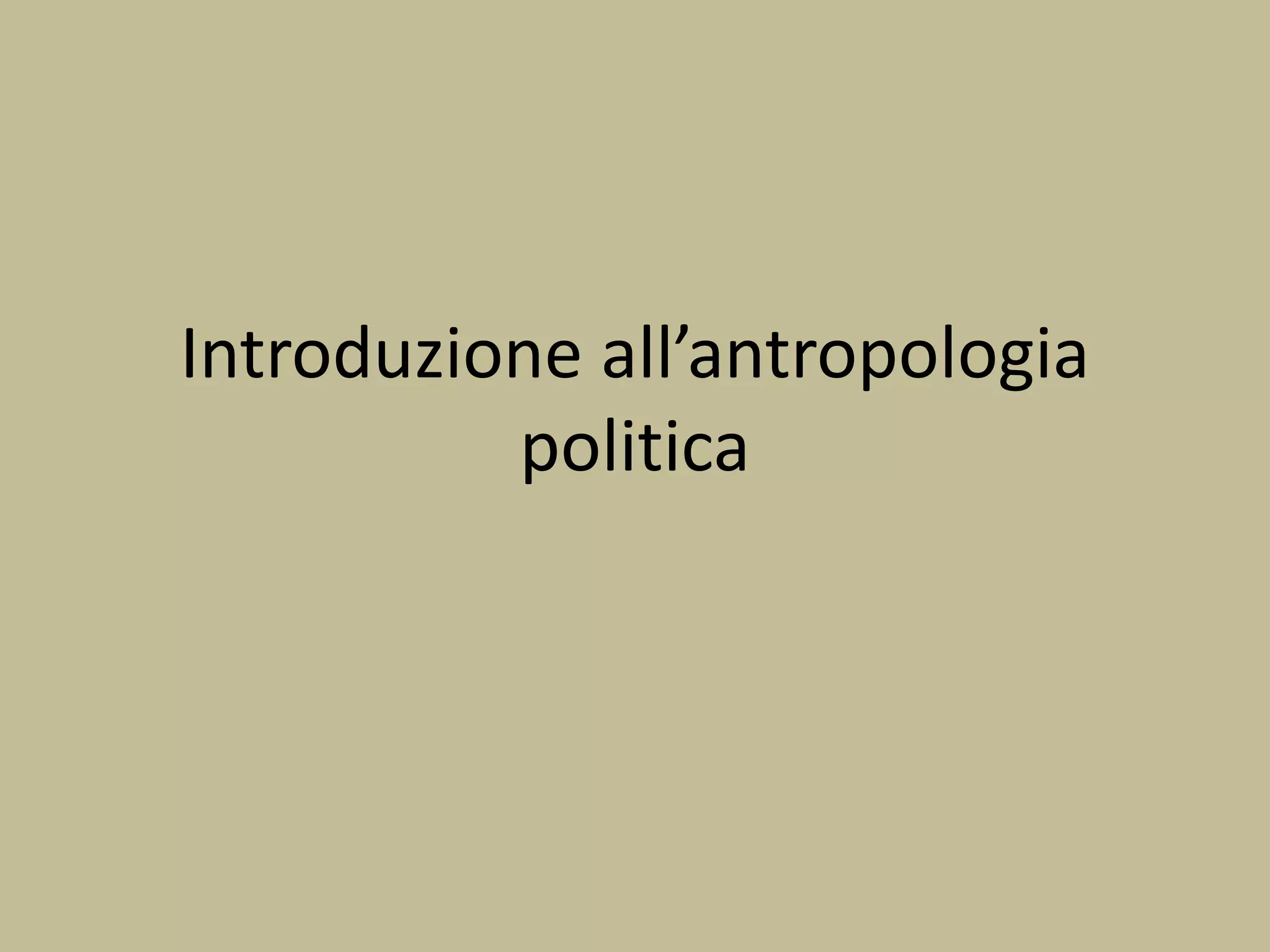 Il documento offre un'introduzione all'antropologia politica, esplorando le teorie di esperti come Henry Maine e Lewis Henry Morgan sull'evoluzione sociale e le strutture di parentela. Esamina la transizione da approcci evolutivi a metodi più dinamici, evidenziando l'importanza di conflitto e processo nelle società politiche. Infine, analizza temi contemporanei come il potere di genere e l'impatto della globalizzazione sulle culture.