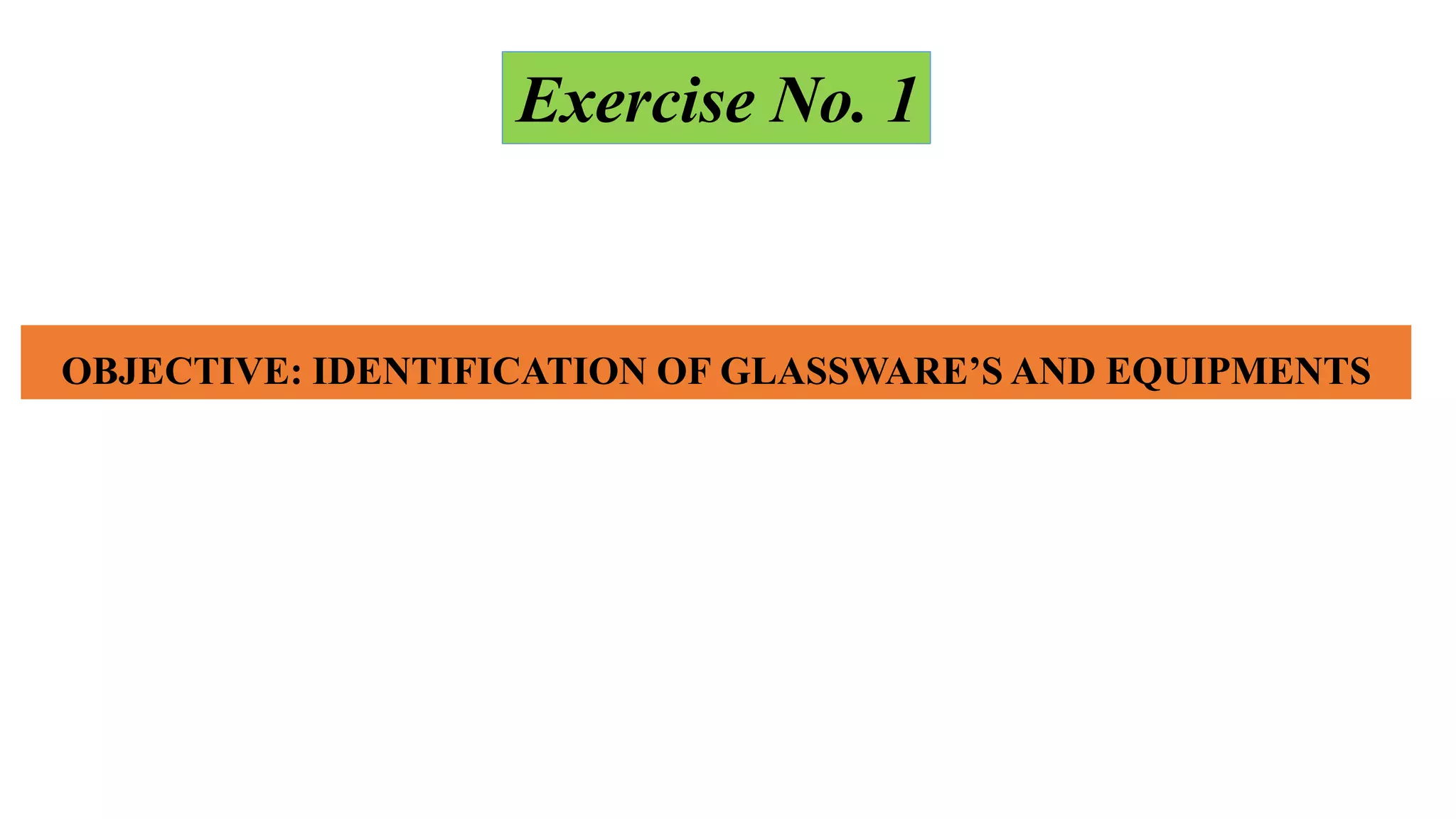 Glassware and equipment commonly used in laboratories are described. This includes beakers for holding liquids, conical flasks for titration and mixing, graduated cylinders for accurately measuring liquid volumes, volumetric flasks for precise dilutions, watch glasses for storing chemicals, evaporating dishes for evaporating solutions, Florence flasks for holding solutions, funnels for transferring substances, wash bottles for rinsing glassware, reagent bottles for storing chemicals, and burettes for precisely adding liquids.