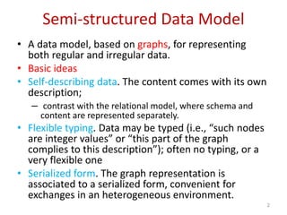 - XML is a data model based on graphs that can represent both regular and irregular data. It allows for self-describing, flexible typing, and serialization of data.
