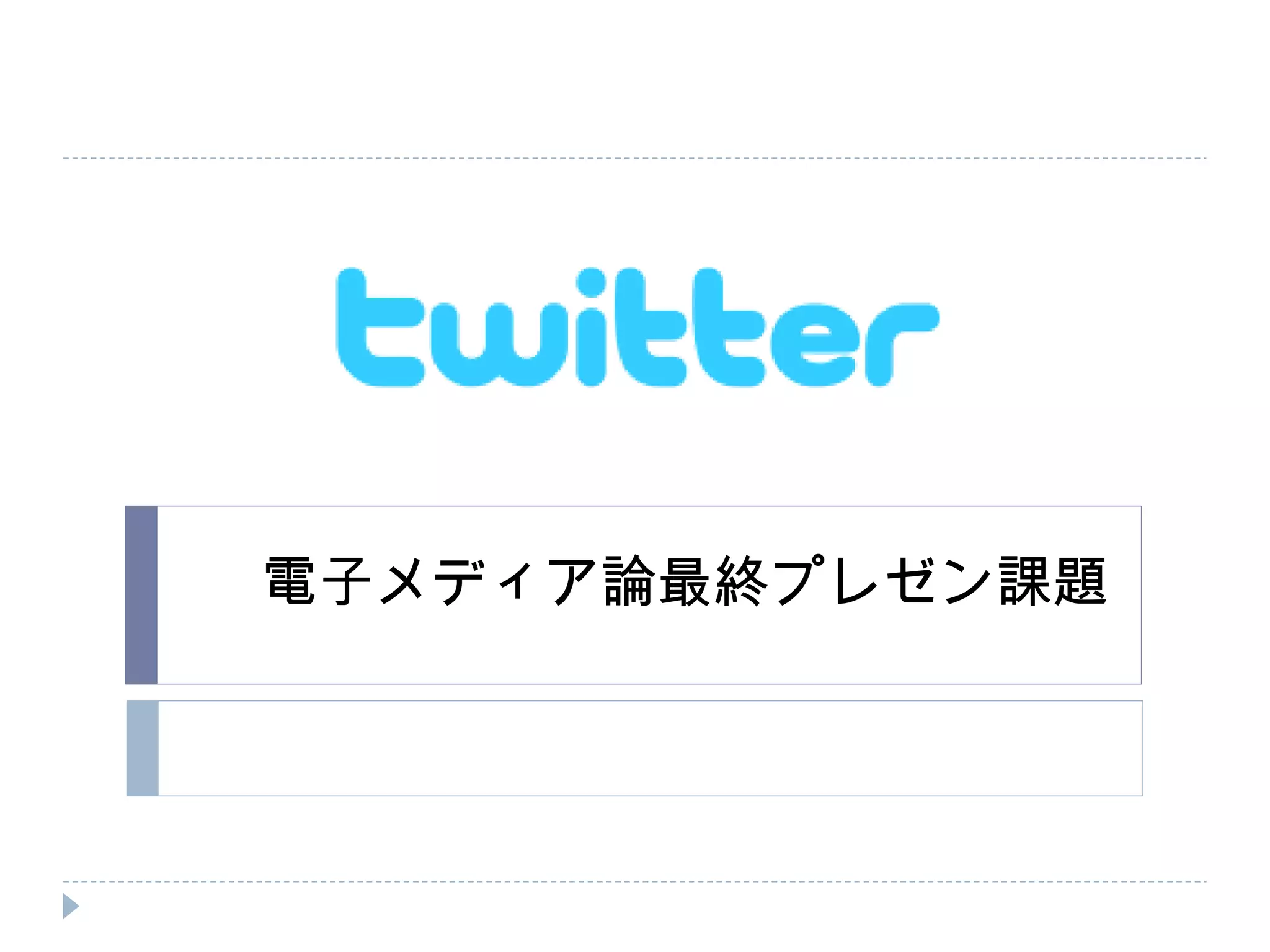 目次 Twitter とは?マスメディアと電子メディアの比較 Twitter が果たす機能・役割① Twitter が果たす機能・役割② Twitter の問題点① Twitter の問題点② まとめと考察 参考文献・ URL - 3.