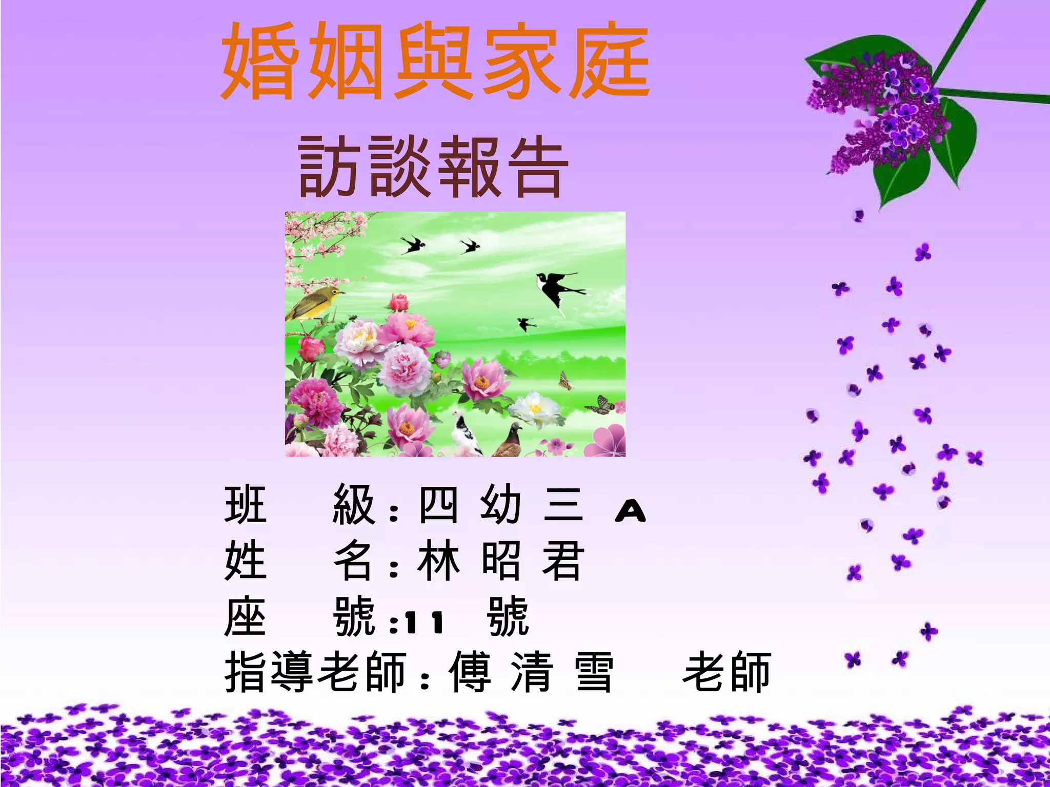 級 : 四 幼 三 A 姓 名 : 林 昭 君 座 號 :11 號 指導老師 : 傅 清 雪 老師