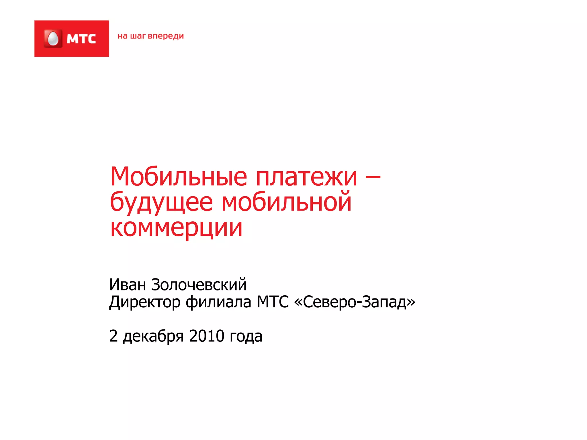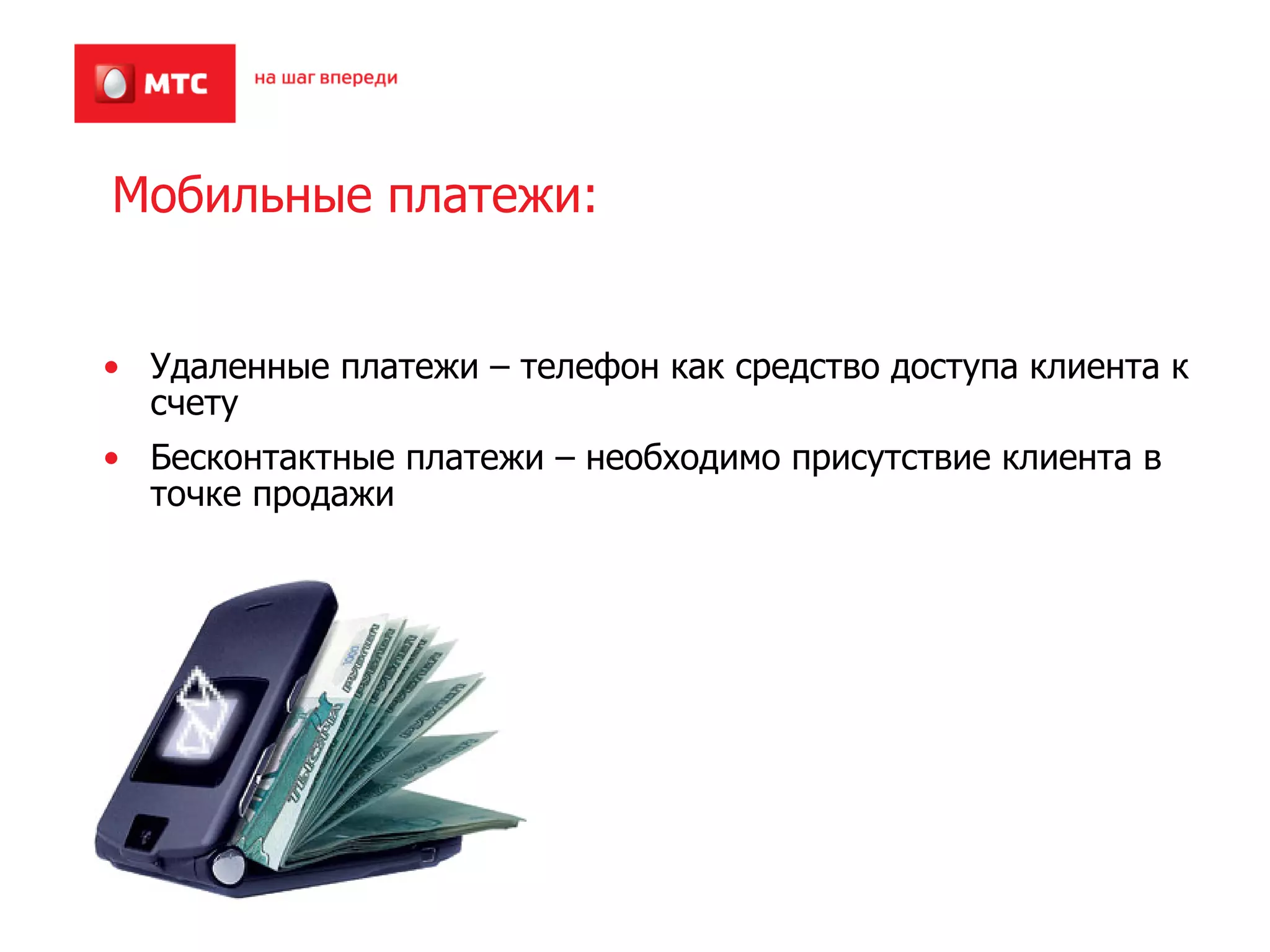 Документ рассматривает мобильные платежи как ключевой элемент будущего мобильной коммерции, описывая удаленные и бесконтактные способы оплаты. Ожидается рост рынка мобильных платежей до $5,4 млрд к 2013 году, с стратегией МТС по увеличению доходов от мобильных платежей до $14 млн. Основными драйверами этого рынка являются удобство использования, минимизация барьеров к подключению и развитие новых технологий, таких как NFC.