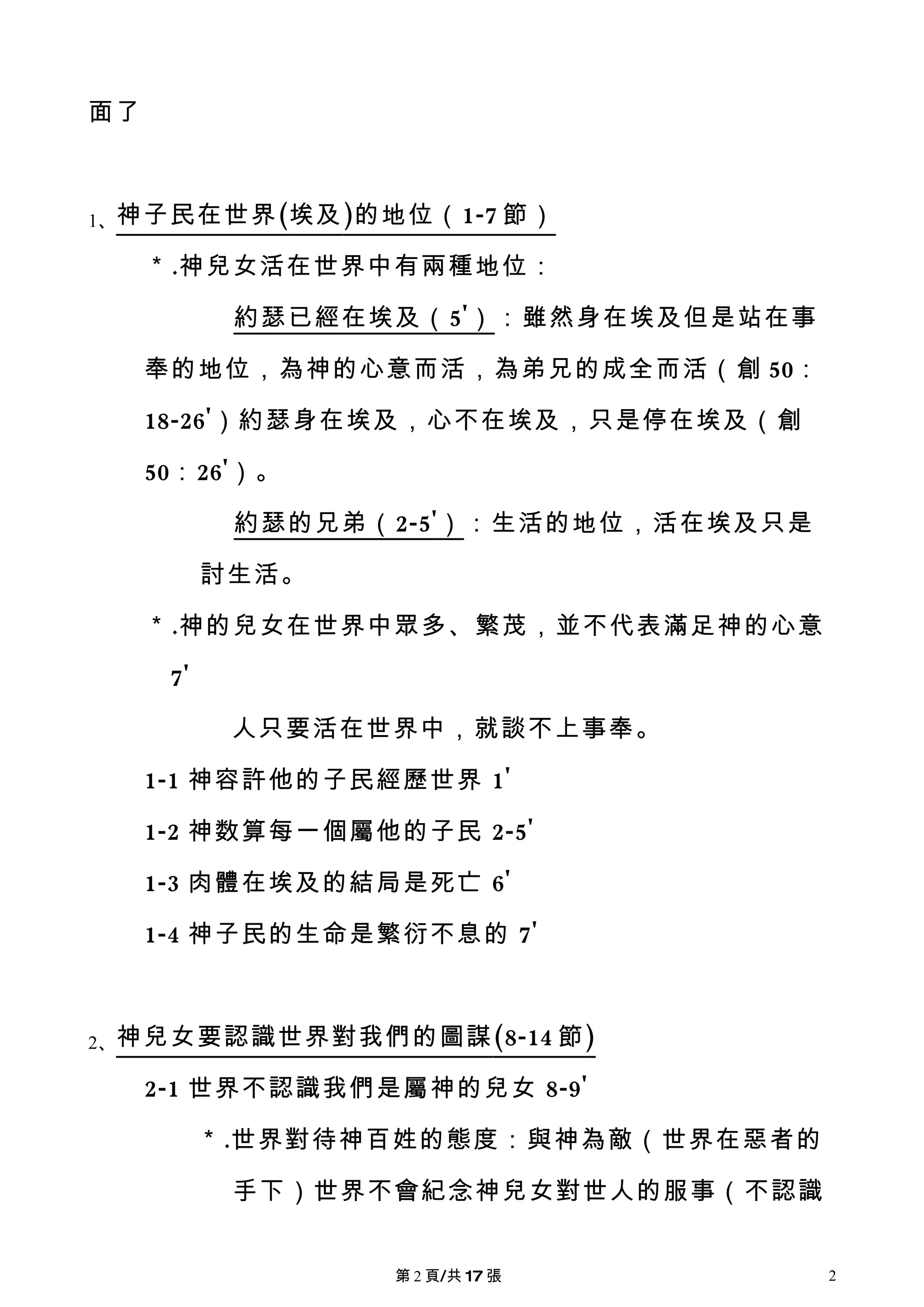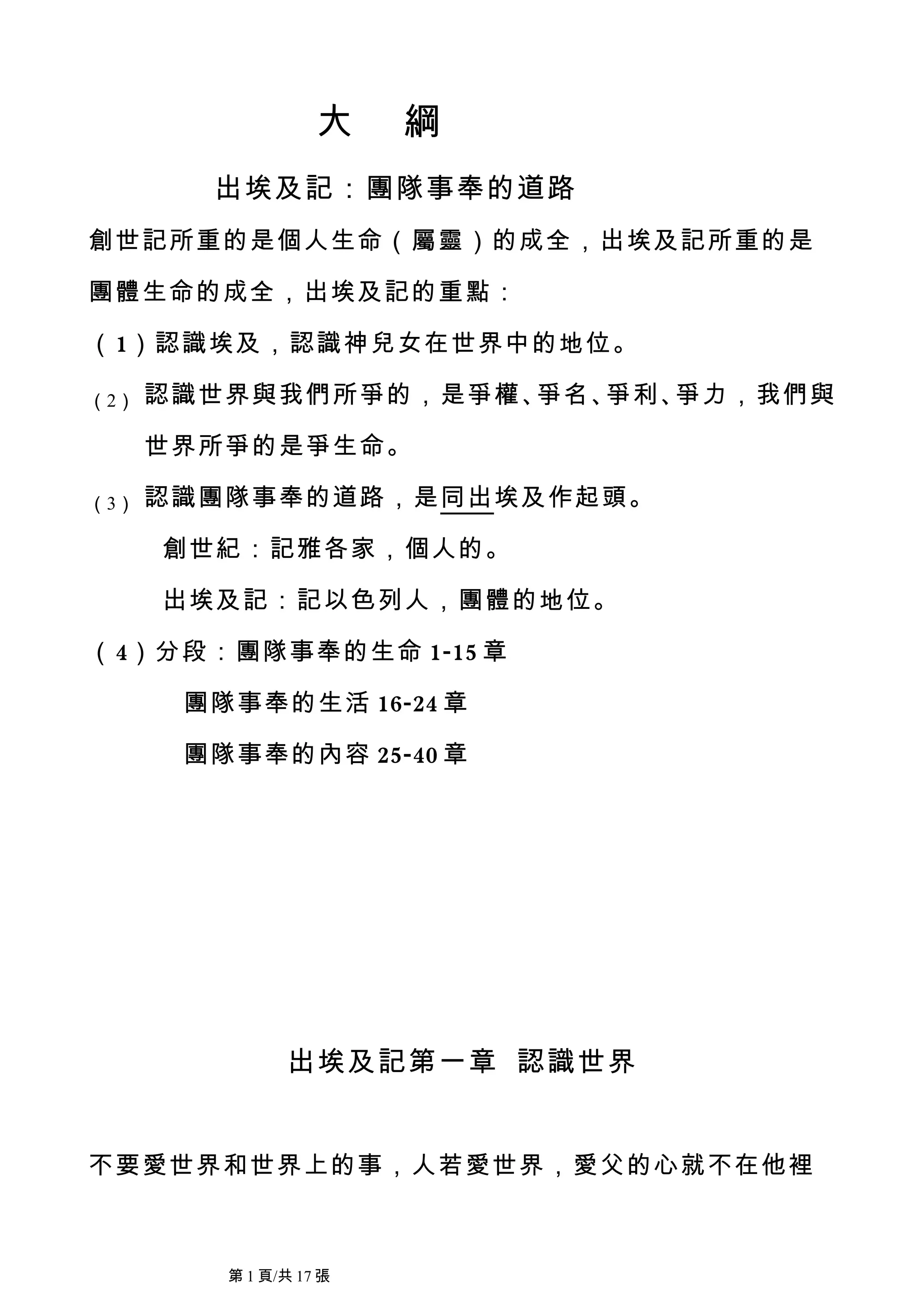 该文档讨论了《出埃及记》中团队事奉的重要性,强调神的子民在世界中的地位以及与世界的斗争。文中指出,团队事奉需要认识神的呼召、责任和对生活的见证,以便实现神的心意。作者提到团队事奉的根本是通过信仰和敬畏神来引导和塑造信徒的生命。