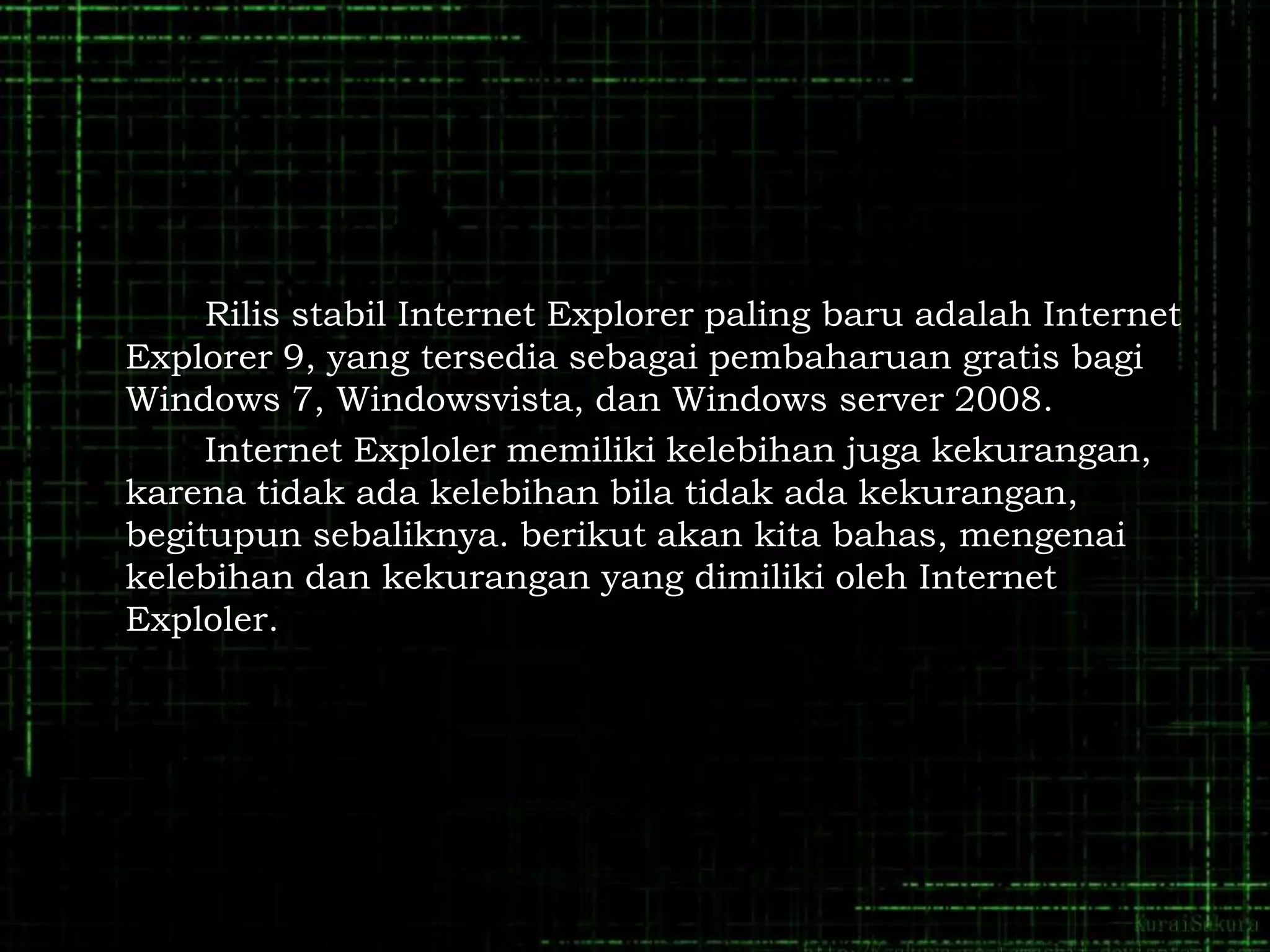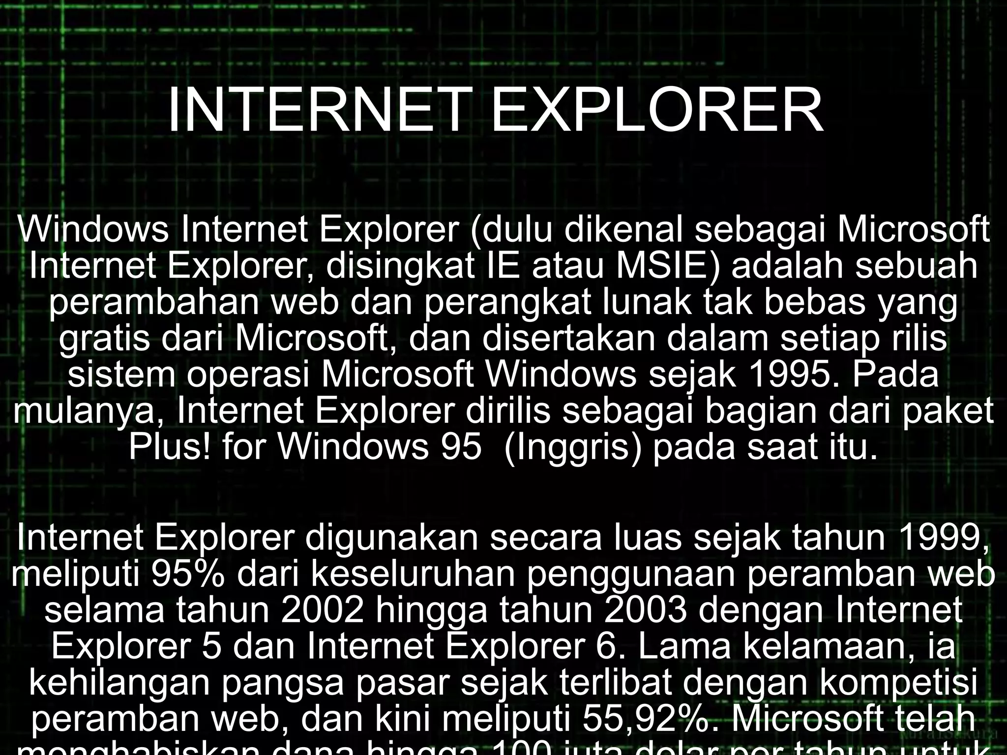 Internet Explorer adalah peramban web yang disertakan dalam Windows sejak 1995. Awalnya sangat populer dengan pangsa pasar 95% pada tahun 2002-2003 namun kemudian menurun karena kompetisi dari peramban lain seperti Firefox, Chrome, dan Opera. Peramban-peramban tersebut memiliki kelebihan seperti kecepatan, fitur tambahan, dan keamanan yang lebih baik dibanding Internet Explorer.