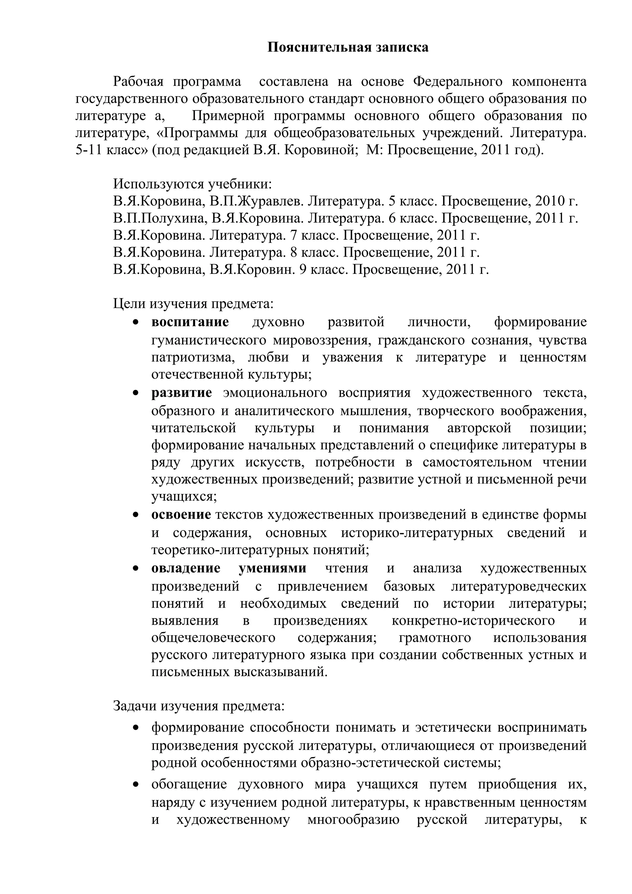Документ представляет собой пояснительную записку к рабочей программе по литературе для основного общего образования, основанной на федеральных образовательных стандартах. Он описывает цели и задачи изучения литературы, включает структуру уроков и содержание учебного материала по классам, а также контроль знаний учащихся. Особое внимание уделяется формированию духовно развитой личности и развитию навыков чтения и анализа литературных произведений.