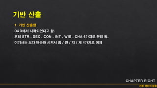 힘 민 지 체 가중치합계 전사 0.6 0.3 0.1 0 1 궁수 0.3 0.6 0.1 0 1 마법사 0.1 0.1 0.8 0 1 공식 : 최종 공격력 = RoundUp(ClassRt * StatPower + ClassRt* StatInt +ClassRt* StatDex +ClassRt* StatCon,0) ClassRt : 직업 가중치 Power : 힘 / Int : 지능 / Dex : 민첩 / Con : 체력