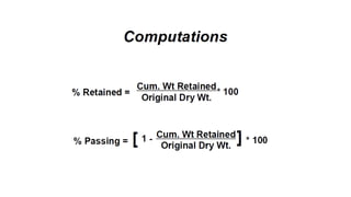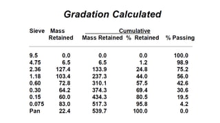 The document discusses aggregate gradation, defining it as the distribution of particle sizes and detailing the steps involved in gradation analysis through washed and mechanical sieve methods. It distinguishes between uniformly graded, well graded, and gap graded aggregates based on interlock and permeability. Additionally, it highlights the use of a (0.45 power) gradation chart and defines maximum size and gradation limits.