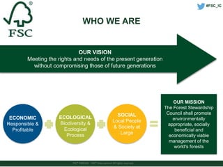 The document discusses the implementation of Free, Prior, and Informed Consent (FPIC) as required by the Forest Stewardship Council (FSC), emphasizing its importance for indigenous peoples managing their lands. It outlines a six-step methodology for certificate holders to engage with indigenous communities, although it notes the lack of best practice examples and previous conflicts. Current efforts include field tests in various countries and plans for additional guidance by the end of 2015.