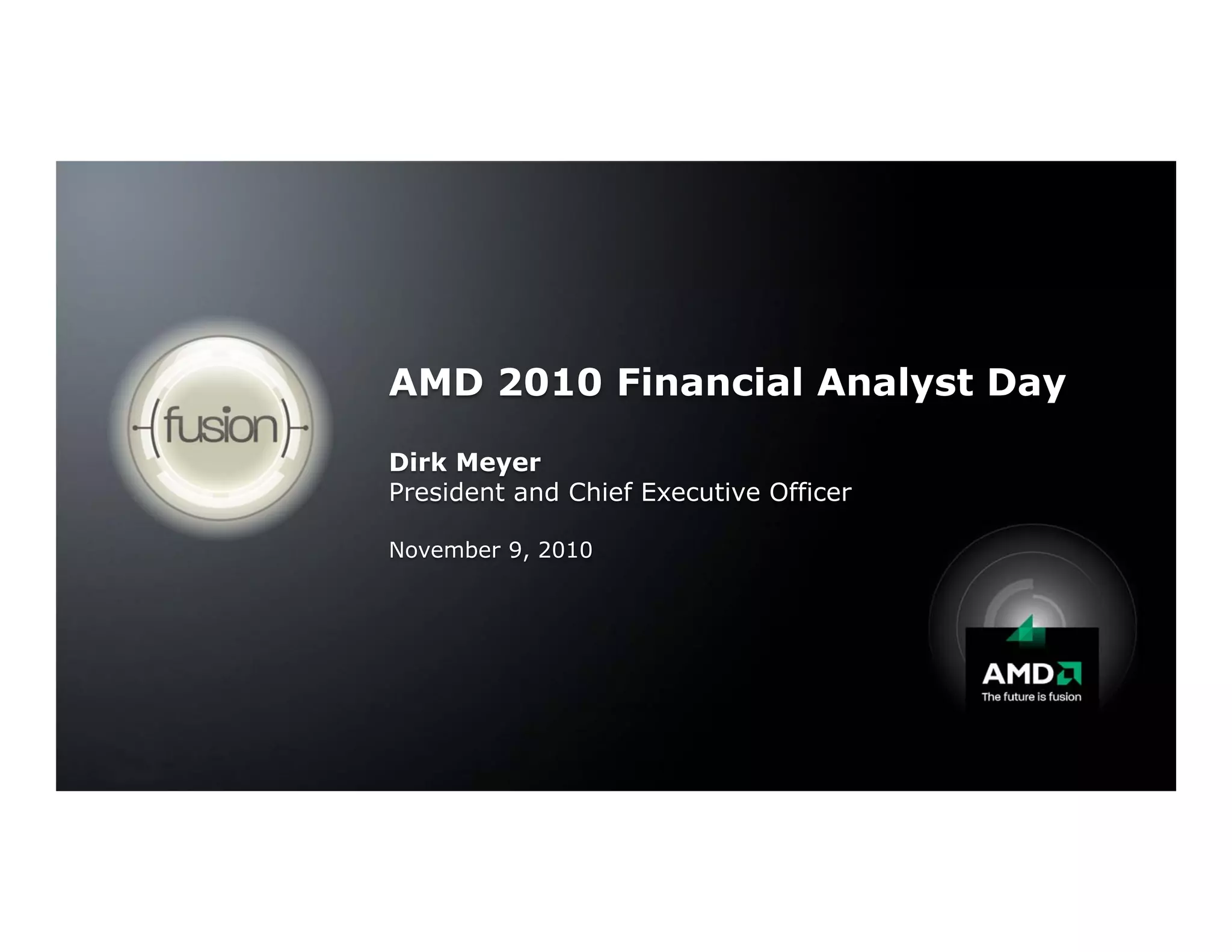 AMD held its 2010 Financial Analyst Day in November. Dirk Meyer, AMD's President and CEO, reviewed the company's success in 2010, driven by gains in market share for AMD CPUs and GPUs. Meyer noted that AMD's target markets of desktops, notebooks, netbooks, servers, game consoles and tablets were large and growing, totaling a $40 billion gross margin pool by 2014. Meyer introduced AMD's new Fusion family of APUs, which integrate CPU and GPU cores on a single chip to converge the trends of computing, graphics and communications.