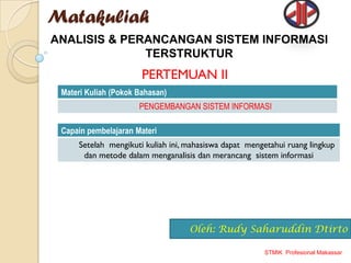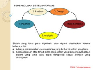 Dokumen ini membahas pengembangan sistem informasi di STMIK Profesional Makassar, termasuk perencanaan, analisis, desain, dan implementasi sistem baru untuk menggantikan sistem lama yang bermasalah. Parameter penting dalam pengembangan mencakup kekuatan, kelemahan, peluang, ancaman, serta sumber daya yang diperlukan. Tujuan utama pengembangan adalah meningkatkan kinerja, kualitas informasi, dan kontrol, serta merespons keluhan pelanggan dan masalah lainnya.