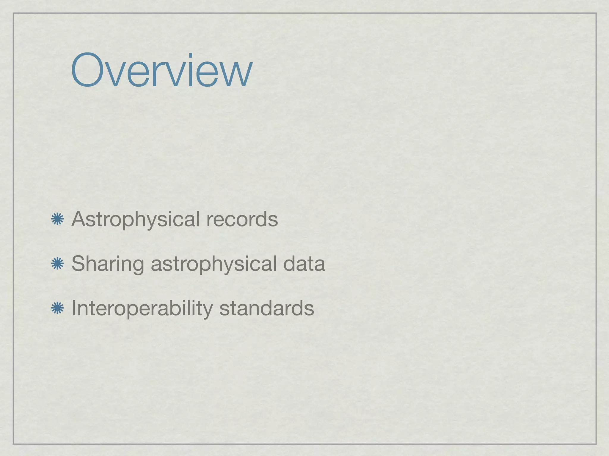The document discusses the interoperability of astronomical data and the standards necessary for effective sharing and representation of astrophysical records. It highlights the diverse nature of these records, including their EM radiation types and varying formats, and the challenges of maintaining consistent semantics across different instruments. The text also touches on the evolution of astronomical catalogues and the importance of standardization in data documentation.