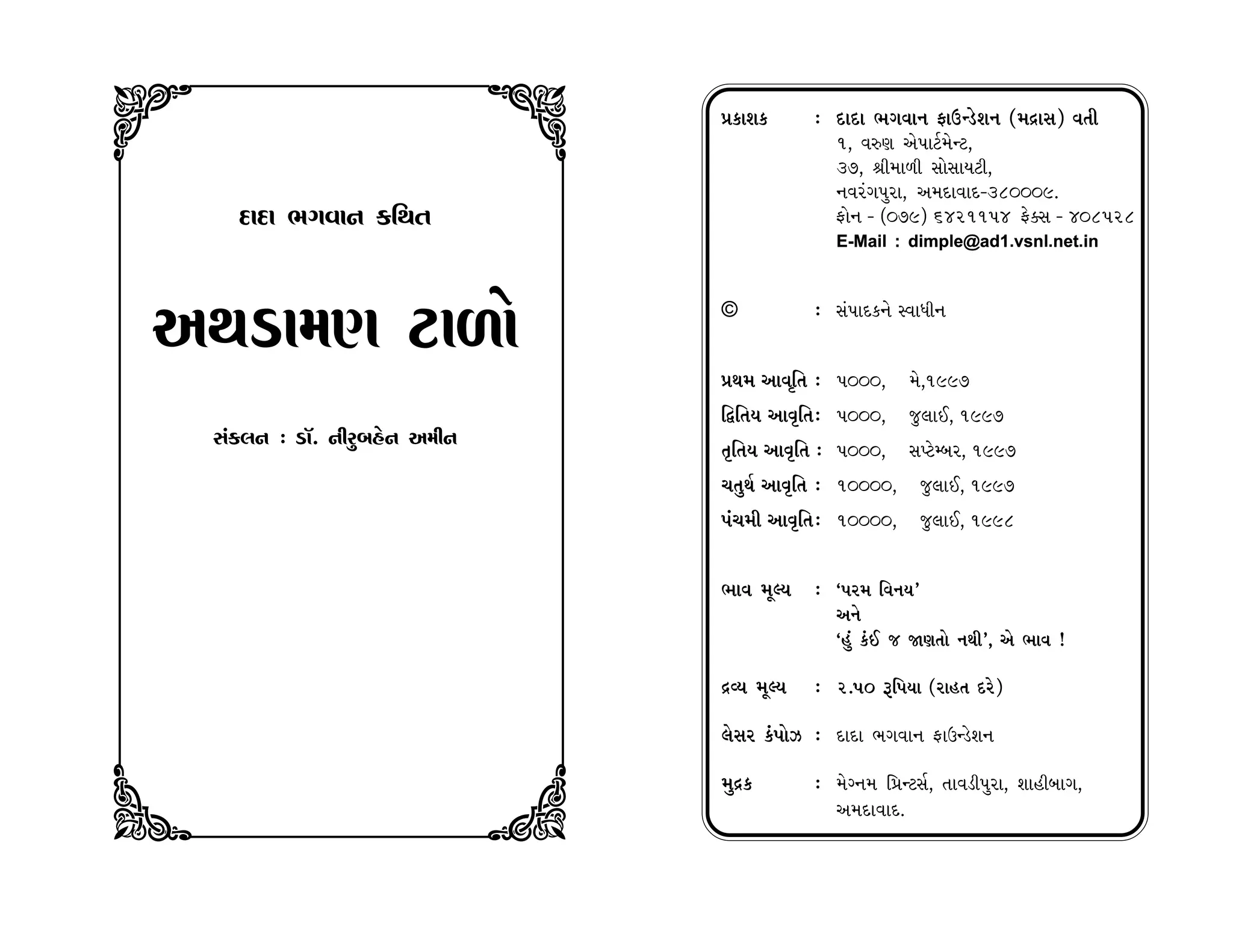 B ≠¿Î¿ — ÿÎÿÎ ¤√‰Îfi ŒÎµLÕıÂfi (‹ƒÎÁ) ‰÷Ì 1, ‰vHÎ ±ı’ÎÀÛ‹ıLÀ, 37, lÌ‹Î‚Ì Á˘ÁΛÀÌ, fi‰fl_√’flÎ, ±‹ÿΉÎÿ-380009. ÿÎÿÎ ¤√‰Îfi ¿Ï◊÷ Œ˘fi - (079) 6421154 Œı@Á - 408528 E-Mail : dimple@ad1.vsnl.net.in © — Á_’Îÿ¿fiı V‰Î‘Ìfi ±◊Õ΋HÎ À΂˘ ≠◊‹ ±Î‰ÏÚ÷ — 5000, ‹ı,1997 ϶Ï÷› ±ÎT≤Ï÷— 5000, …·Î¥, 1997 Á_¿·fi — ÕΘ. fiÌfl⁄Ëıfi ±‹Ìfi I≤Ï÷› ±ÎT≤Ï÷ — 5000, ÁMÀıQ⁄fl, 1997 «÷◊˝ ±ÎT≤Ï÷ — 10000, …·Î¥, 1997 ’_«‹Ì ±ÎT≤Ï÷— 10000, …·Î¥, 1998 ¤Î‰ ‹ÒS› — “’fl‹ ωfi›” ±fiı “Ë_ ¿o¥ … ΩHÎ÷˘ fi◊Ì”, ±ı ¤Î‰ ! ƒT› ‹ÒS› — 2.50 wÏ’›Î (flÎË÷ ÿflı) ·ıÁfl ¿o’˘{ — ÿÎÿÎ ¤√‰Îfi ŒÎµLÕıÂfi C D ‹ƒ¿ — ‹ıBfi‹ Ï≠LÀÁ˝, ÷ΉÕÌ’flÎ, ÂÎËÌ⁄Î√, ±‹ÿΉÎÿ.