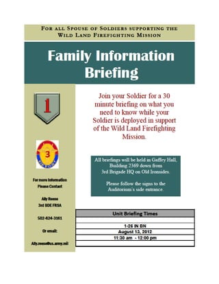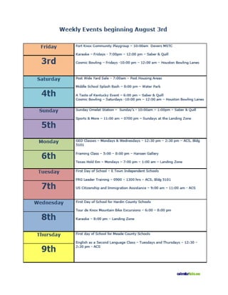 The document provides information about upcoming Army Community Service Family Readiness Group (FRG) training dates in August 2012. It lists 6 training dates ranging from August 2nd to August 27th and provides contact information for registering. It also has information about volunteer opportunities and military counseling resources. The bottom of the document has additional notes about school menus, graduation requirements, and upcoming community events at Fort Knox.