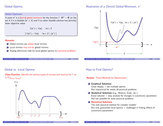 - Local and global optima are defined, with local optima being points where no nearby points have lower objective values, and global optima having no other feasible points with lower values.