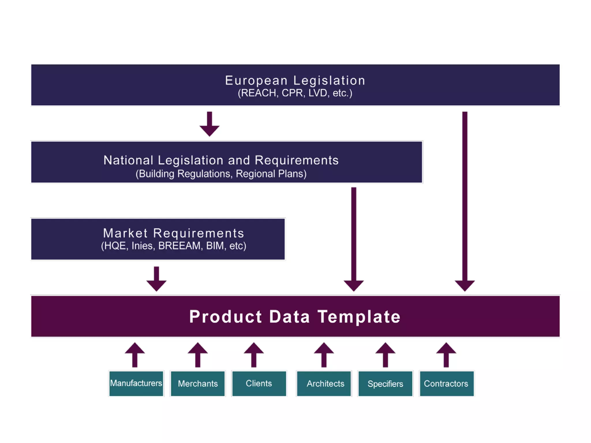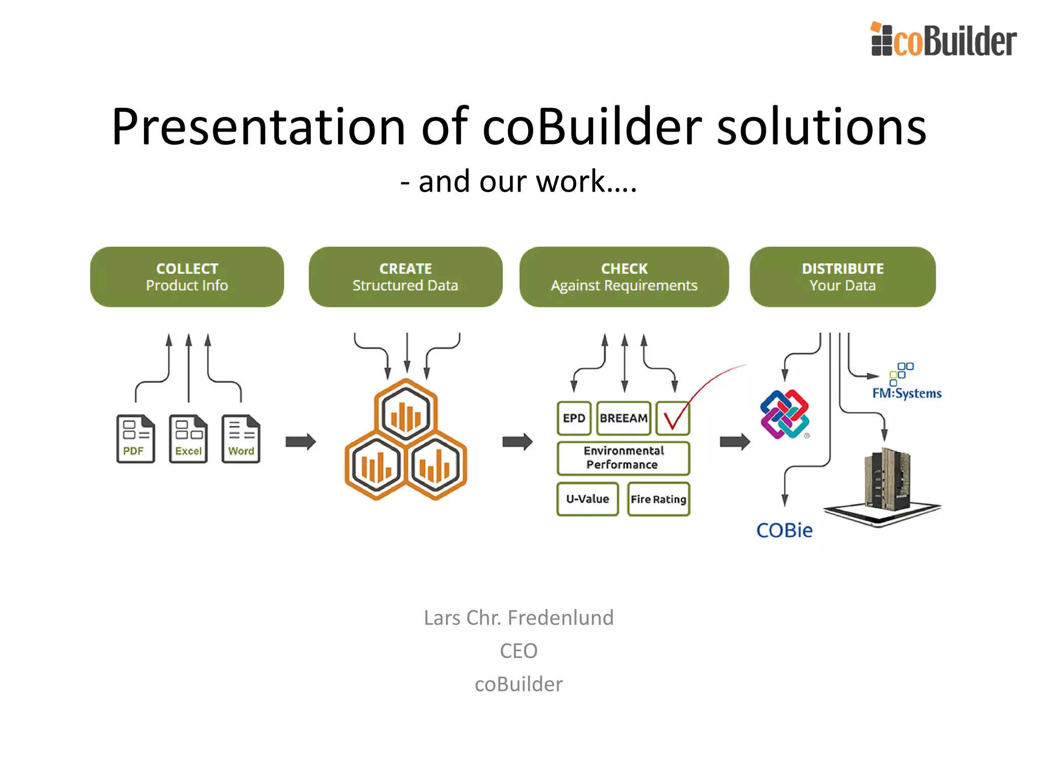 The document outlines CoBuilder's solutions and processes in managing product data, particularly in relation to the BuildingSMART Data Dictionary (BSDD) and compliance with standards like REACH and CPR. It emphasizes the development of Product Data Templates (PDT) and the importance of using open BIM for efficient data management. Additionally, it highlights CoBuilder's collaboration with European associations to support industry standards and requirements.