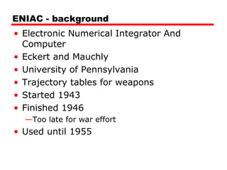 The document discusses the evolution of computer architecture from early computers like ENIAC to modern multi-core processors. It describes key developments like the stored-program concept, transistor-based computers, microprocessors, increased integration through Moore's Law, and performance improvements through caching, pipelining, and parallelism. The evolution of Intel and PowerPC processors is also summarized.