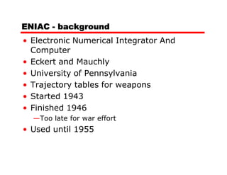 This document summarizes the evolution of computer architecture from early computers like ENIAC through modern multi-core processors. It discusses key developments like stored programs, transistors replacing vacuum tubes, integrated circuits, memory hierarchies, and parallelism through pipelining and multiple cores. Moore's Law of increasing transistor counts is also summarized.
