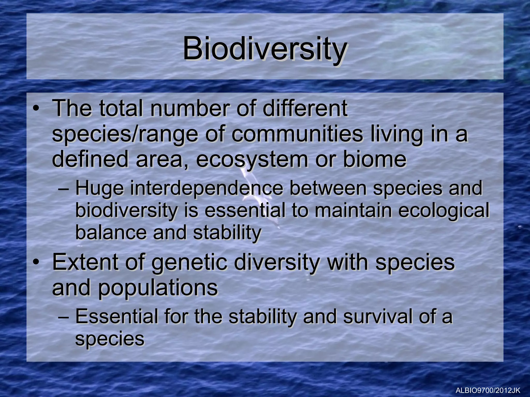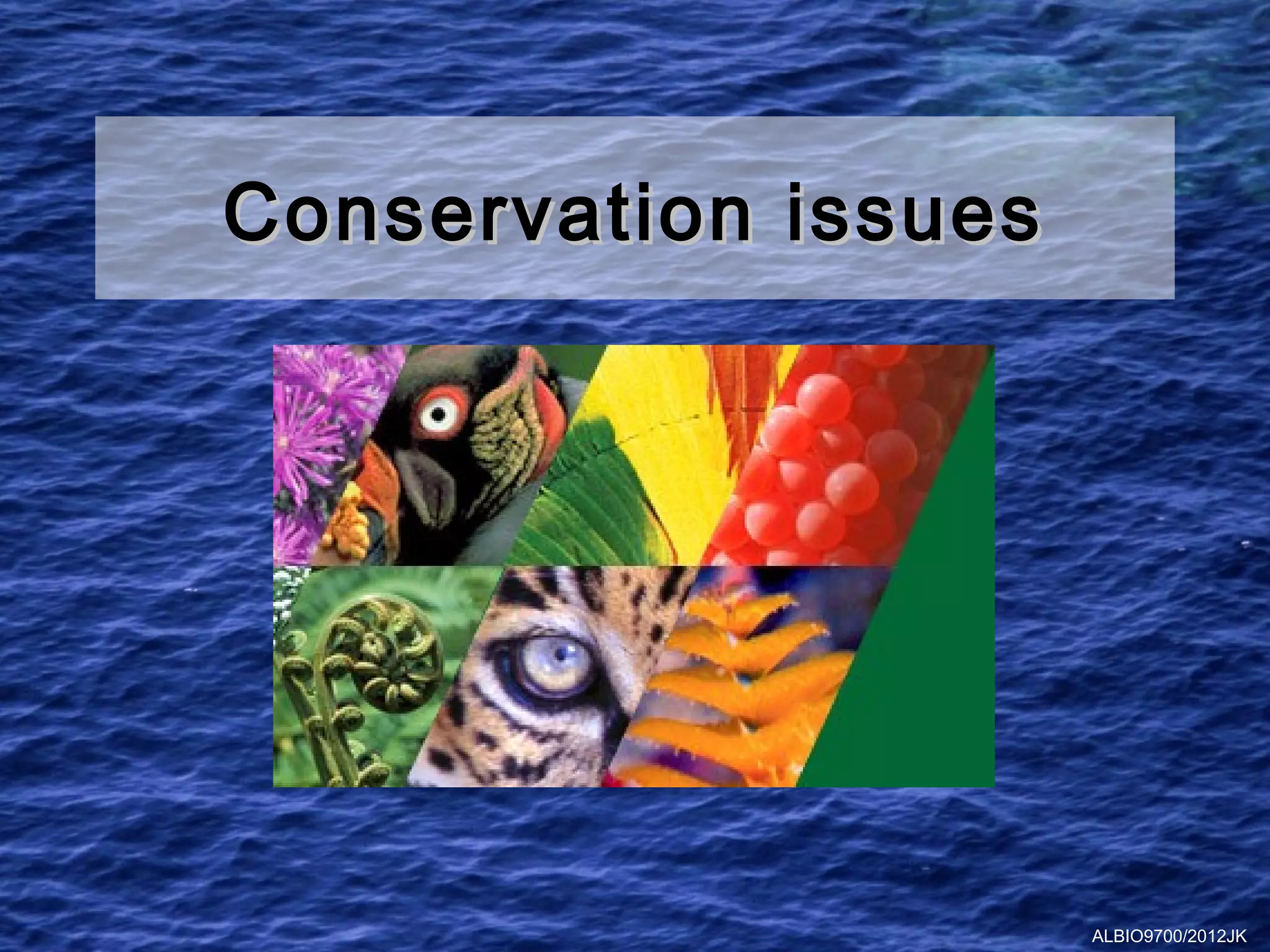 This document discusses several key issues related to biodiversity conservation. It begins by defining biodiversity and explaining its importance for ecological balance. It then outlines some of the main threats to biodiversity, known as the "HIPPO factors" - habitat loss, invasive species, pollution, population growth, and overexploitation. The document also discusses reasons for maintaining biodiversity from both biological and human perspectives. It provides examples of endangered species like African elephants and orangutans and reasons for their endangerment. Finally, it outlines several methods used to protect endangered species, including zoos, botanic gardens, seed banks, and national parks.