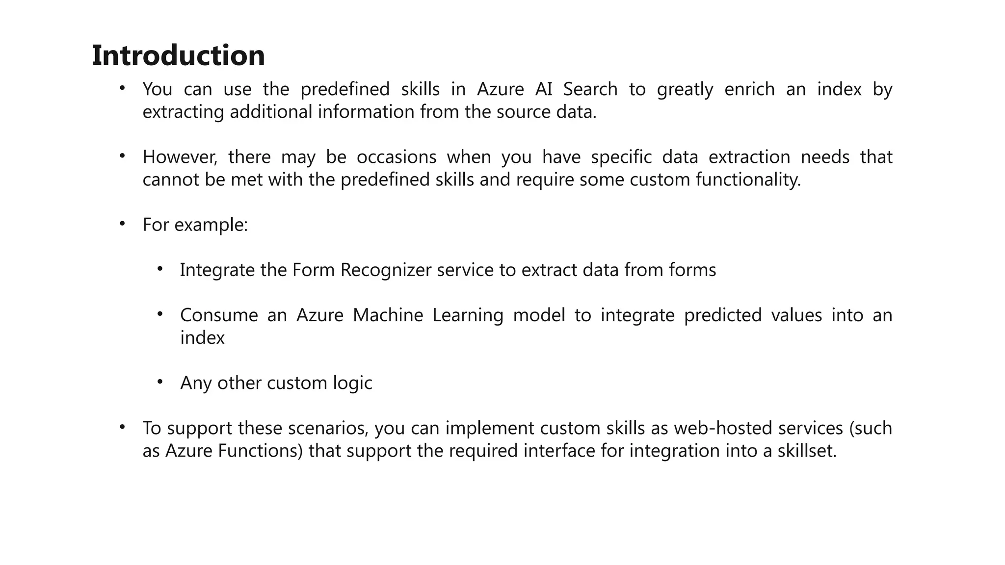 The document explains how to create and integrate custom skills into Azure AI Search to meet specific data extraction needs that predefined skills cannot address. It outlines the requirements for input and output schemas, as well as the process for adding a custom skill to a skillset using the custom.webapiskill type. The document also includes a knowledge check to reinforce understanding of implementing custom skills.