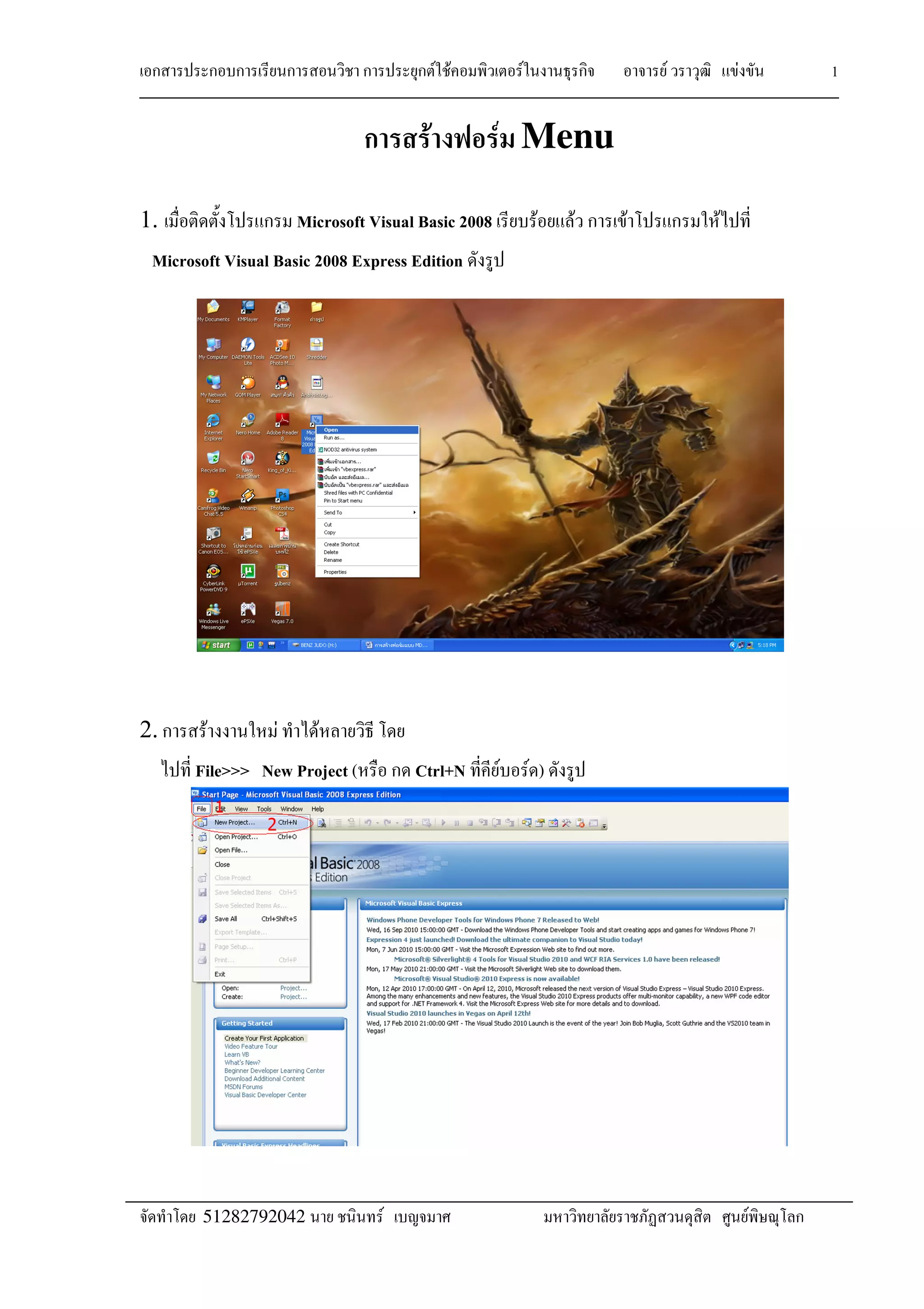 1. The document discusses creating a menu strip in a Windows Forms application in Microsoft Visual Basic 2008.