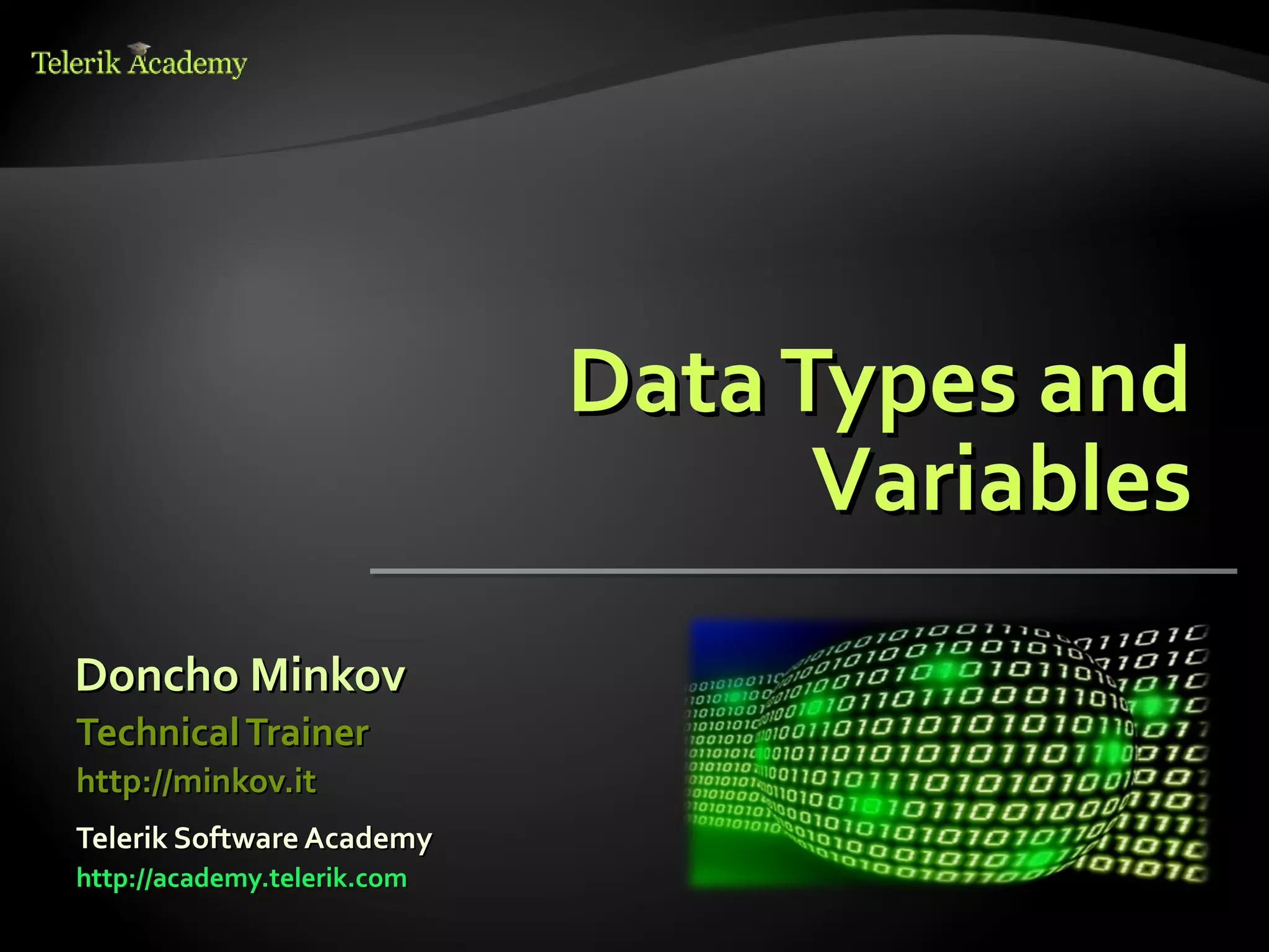 This document discusses data types and variables in JavaScript. It describes the main data types - integer, floating-point, boolean, and string. It explains that variables are used to store and manipulate data in memory, and have a name, type, and value. The document also covers declaring variables with the var keyword, assigning values to variables, and initializing variables before use.