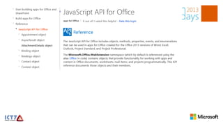 This document discusses new developments for application development in SharePoint 2013, including the introduction of the SharePoint app model and apps for Office. It outlines problems with previous custom code approaches and how the new app model addresses these. The document also covers the new client-side object model, improved web content management features in SharePoint 2013, and the new workflow platform and capabilities in SharePoint Designer workflows.