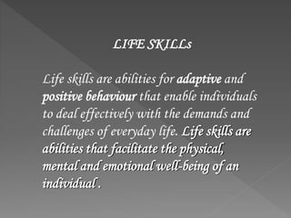 This document defines and describes various life skills including decision making, creative thinking, critical thinking, problem solving, negotiation skills, interpersonal relationships, self-awareness, empathy, effective communication, and managing feelings and emotions. It explains that life skills help individuals deal effectively with everyday challenges and demands, and facilitate well-being. Developing these skills can help people make the most of life by accomplishing goals and living to their full potential.