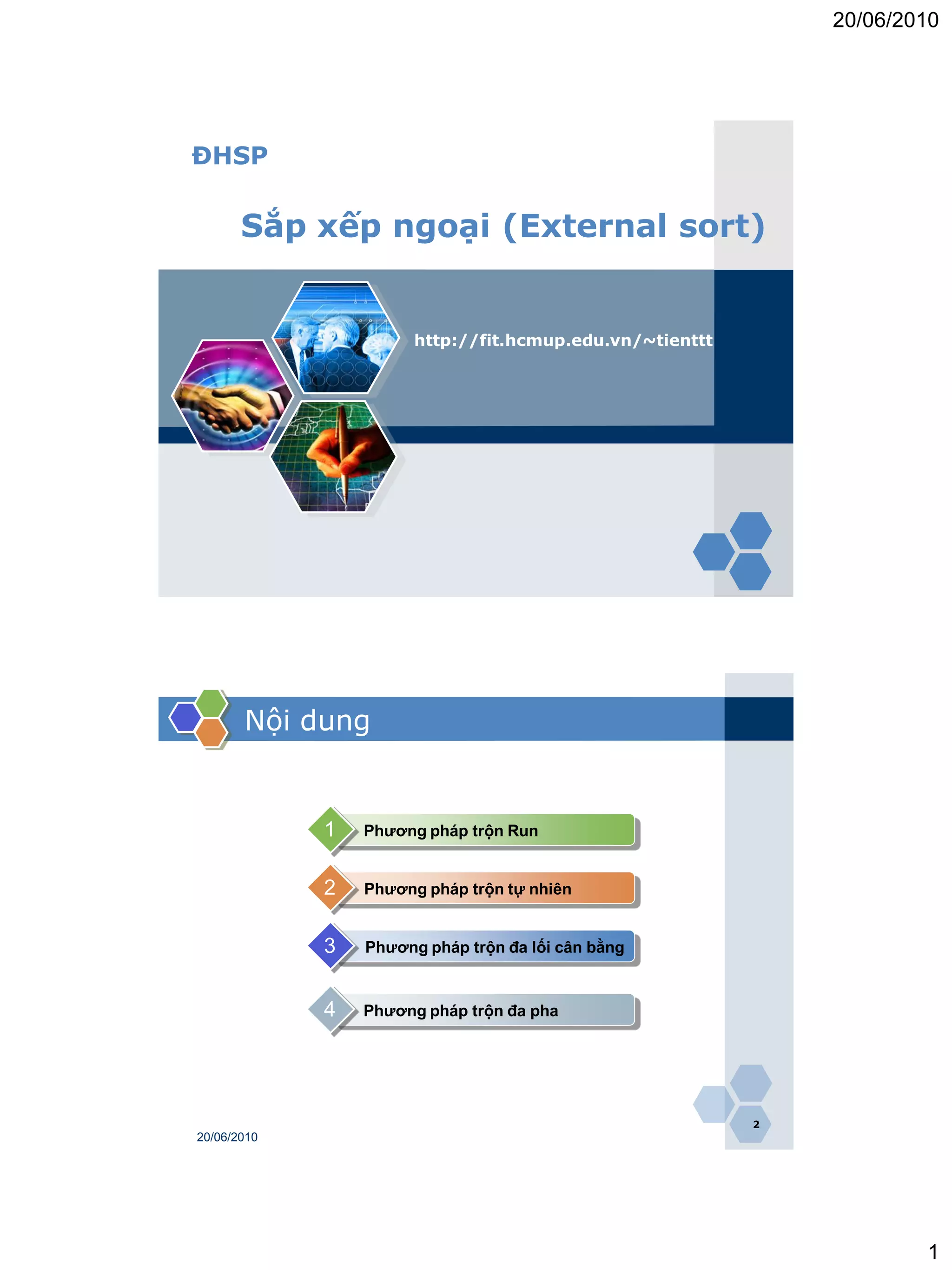 Tài liệu trình bày các phương pháp sắp xếp ngoại, bao gồm trộn run, trộn tự nhiên, và trộn đa lối cân bằng, nhằm giải quyết bài toán sắp xếp trên file. Các phương pháp này tối ưu hóa thao tác sắp xếp dữ liệu với yêu cầu tiết kiệm không gian và thao tác. Đặc biệt, phương pháp trộn đa lối cân bằng được nhấn mạnh với cách giảm số bước thực hiện để tối ưu chi phí sắp xếp.