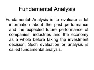 Fundamental analysis evaluates past and expected future performance of companies, industries, and the overall economy. It includes analysis of economic, industry, and company-specific factors. The analysis of these three levels constitutes the main activity in fundamental security analysis and investment decision making. Key factors analyzed include economic growth rates, inflation, interest rates, government spending, infrastructure, exchange rates, and seasonal impacts. The goal is to estimate future share prices and business performance.