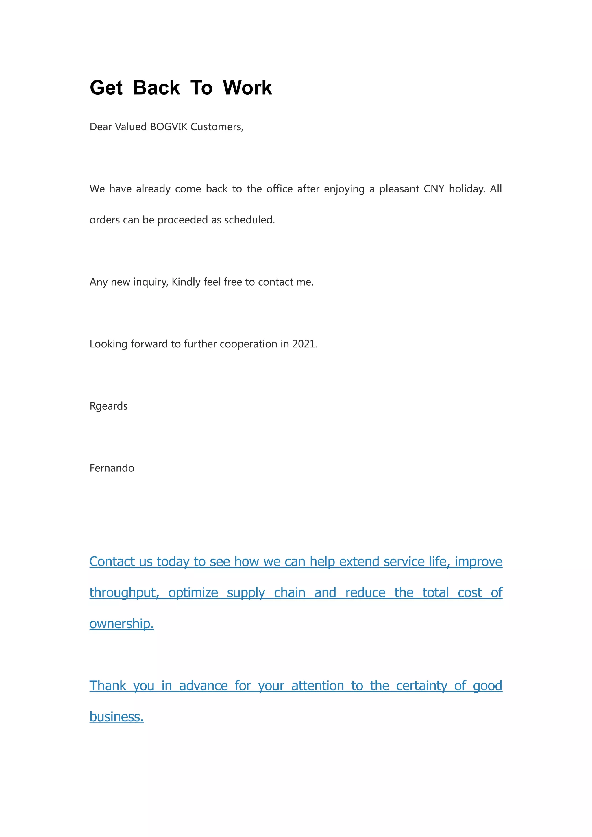 Bogvik is back to work after the Chinese New Year holiday and is processing all orders as scheduled. Customers are encouraged to reach out for inquiries and cooperation in 2021. The company aims to help improve service life, throughput, supply chain optimization, and reduce costs.