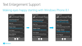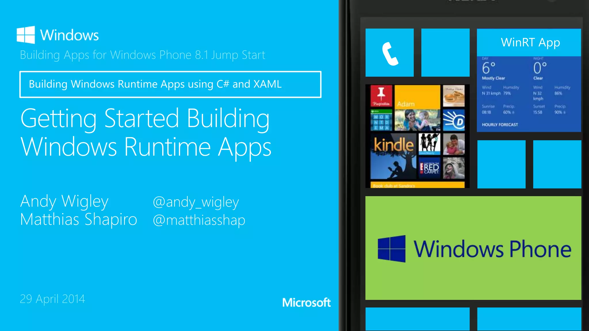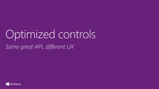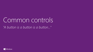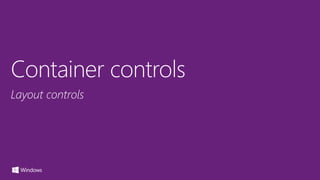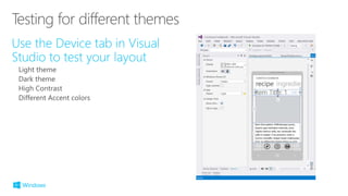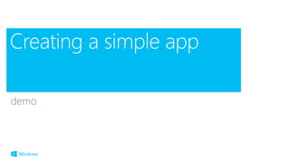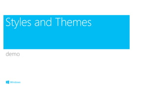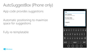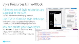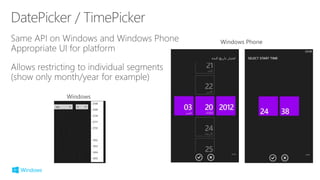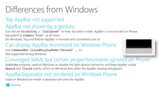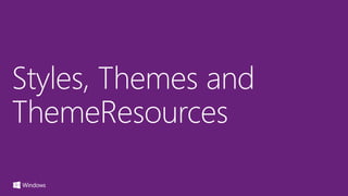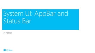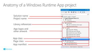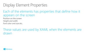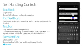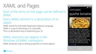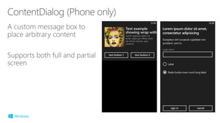 This document outlines the process of building Windows Runtime XAML apps for Windows Phone 8.1, including XAML layout elements such as StackPanels, Grids, and Buttons. It provides practical coding examples for handling user interactions with buttons and content dialogs, as well as details on managing appbar commands and status bar properties. The information emphasizes performance considerations and the use of resources in application development.
