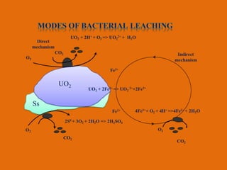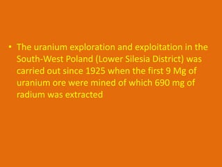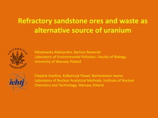 This document discusses using refractory sandstone ores and waste as alternative sources of uranium in Poland. It describes how uranium exploration was previously conducted in the region. Biotechnology offers possibilities to extract uranium as a byproduct from other rare element recovery processes. Studies show that organic compounds in shale and sandstone conglomerates are the main carriers of uranium in the region's deposits. The document also examines concentrations of various elements in the deposits and losses during processing. Microbial consortia have been isolated that are able to leach uranium from ores and wastes under neutral and acidic conditions, extracting up to 95% of uranium. "Green" biosynthesis using microbes is presented as an environmentally friendly method of extracting