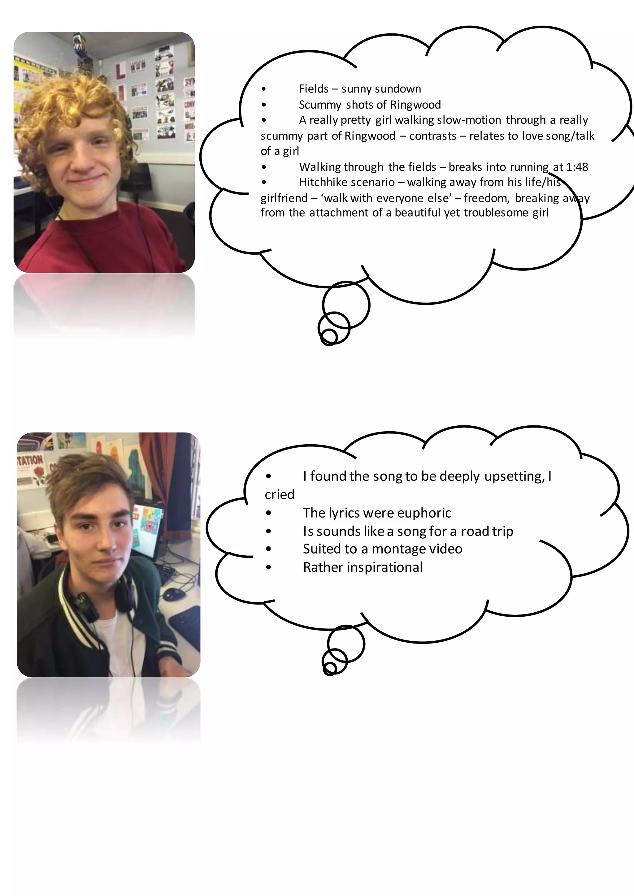 The document provides feedback and suggestions for a music video to accompany a song described as happy and inspirational for travel. It recommends visuals of people with strong friendships traveling the world, starting slow to match the song's pace and gradually speeding up. Location shots could include beaches, waterfalls, and tropical places to depict a sunny holiday. Effects like slow motion and color tints could make the clips look perfect and magical.