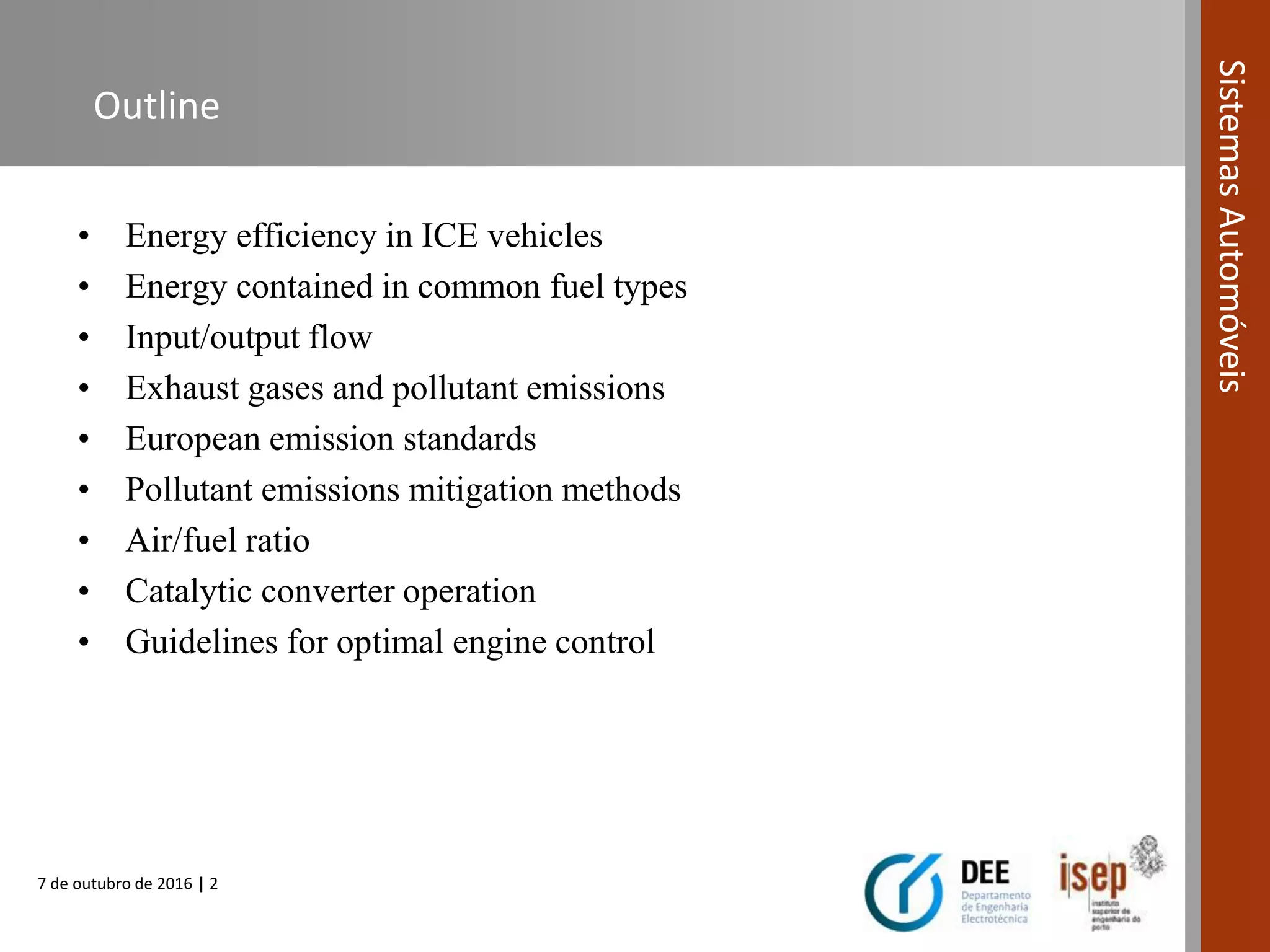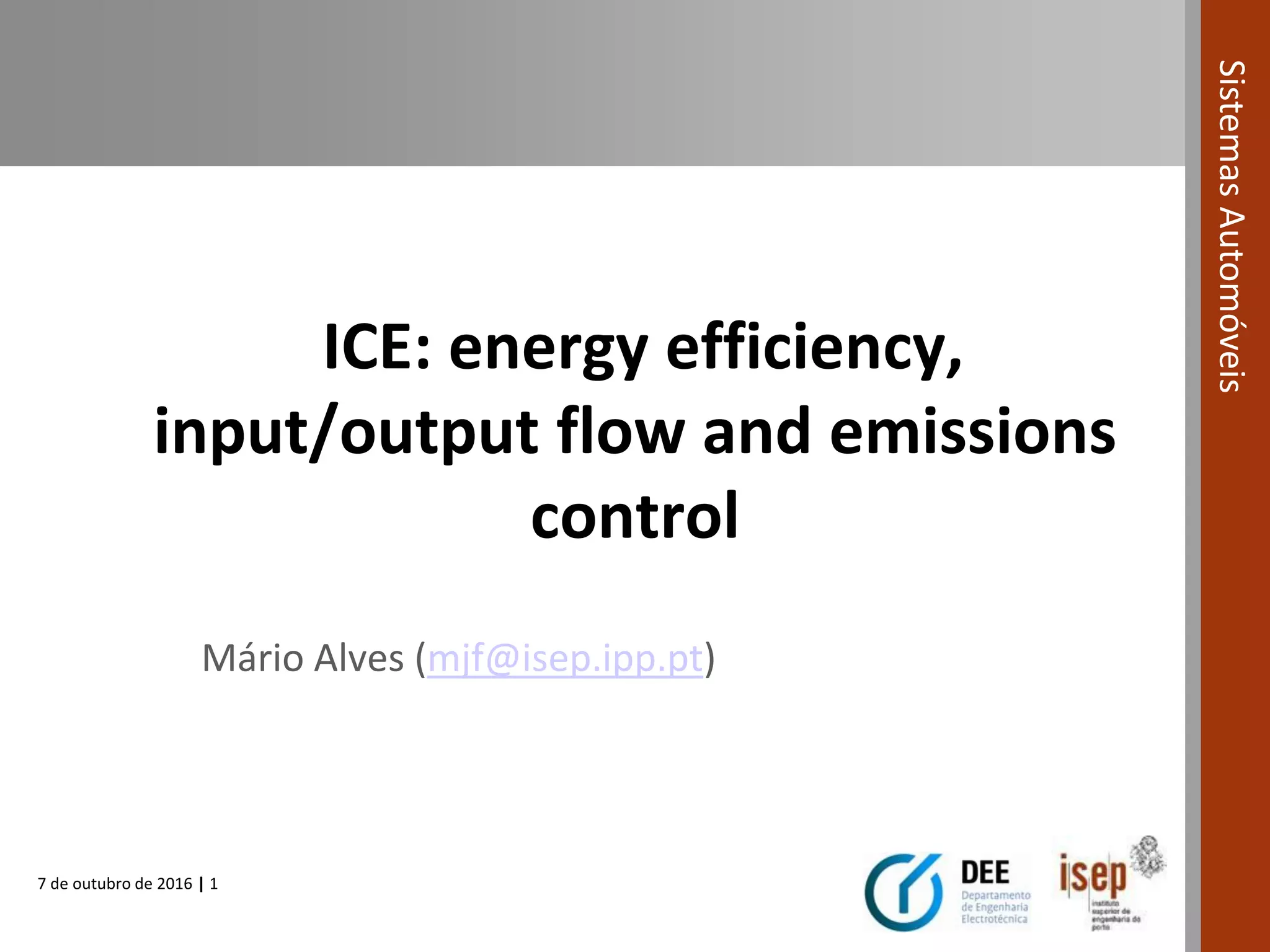 This document discusses internal combustion engines (ICEs) and their energy efficiency, input/output flows, emissions control, and methods for optimizing engine control. It covers topics like typical energy losses in ICE vehicles, the energy content of common fuels, exhaust gas composition and pollutant emissions, European emission standards, ways to mitigate pollutants like optimizing the air/fuel ratio and catalytic converter operation, and guidelines for optimal engine control through sensors and actuators. Tables and diagrams are provided to illustrate concepts like energy distribution, air/fuel ratios, and catalytic converter function.