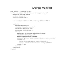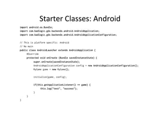 This document provides an introduction and overview of libGDX, a framework for building cross-platform games in Java. It discusses libGDX's capabilities for 2D and 3D games on Android, desktop, HTML5 and iOS. It also covers libGDX's project structure, compiling with Gradle, starter classes for different platforms like Android and desktop, logging app lifecycles, important libGDX modules, and loading assets.