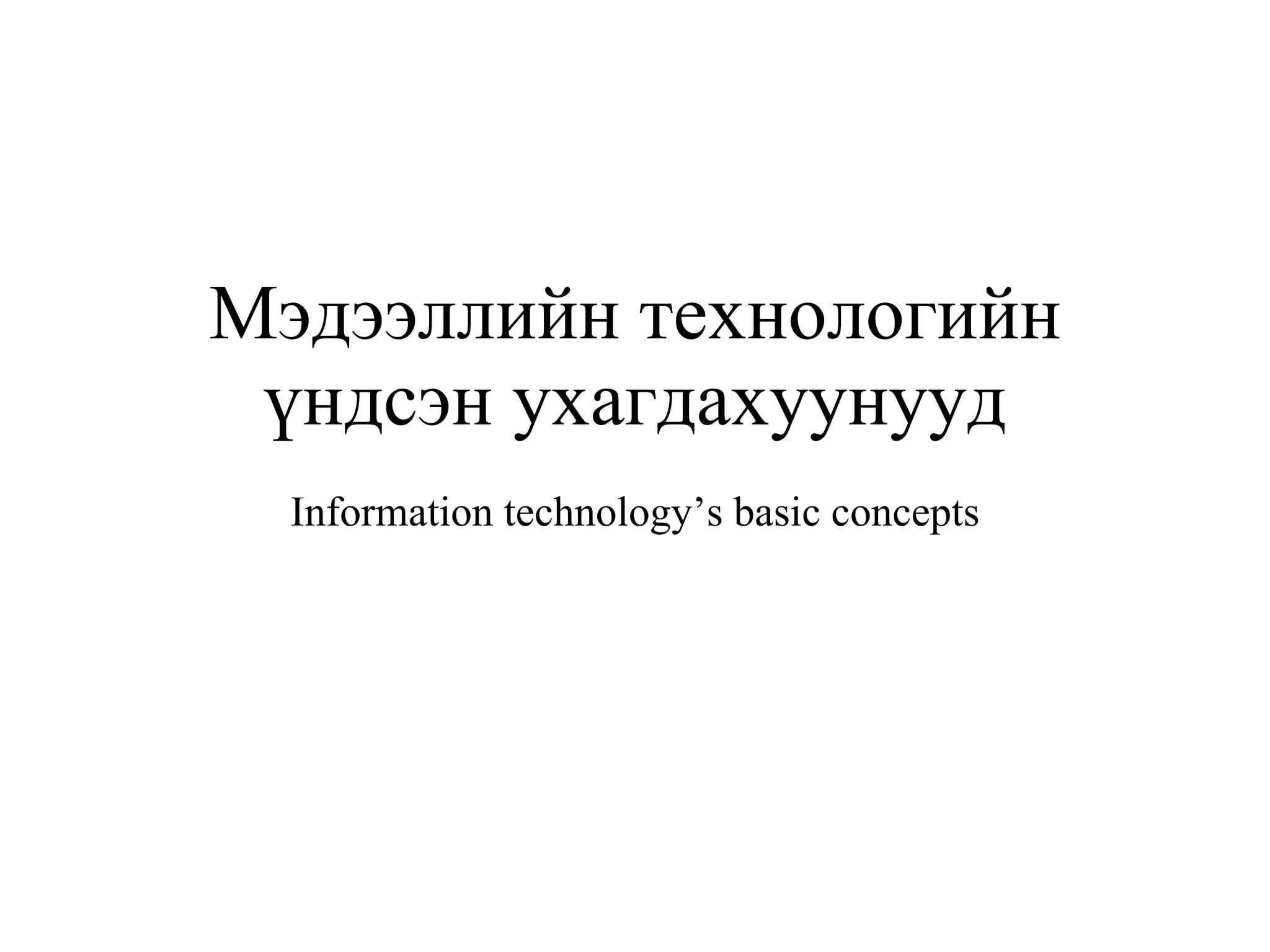 02 it concepts 1. 2. Зорилго Goal Мэдээллийн технологийн ерөнхий түвшний суурь ухагдахуунуудыг ойлгож авах. Одоогийн компьютерийн төрх, програм хангамж, техник хангамж . Мэдээллийн сүлжээг ямар зорилгоор ашиглах, хүн өдөр тутмын амьдралдаа компьютерт суурилсан тооцооллын програм хангамжийг хэрхэн ашиглах тухай ойлголттой болно. Түүнчлэн компьютер ашигладаг салбарын орчин дахь эрүүл мэндээ хамгаалах, компьютертэй аюулгүй ажиллах ажиллагааны талаар, компьютер ашиглаж байх үеийн соёл, мэдээллийн хамгаалалт, хуулийн заалтын талаар суурь мэдлэг олж авна. 3. Гарах үр дүн Result Мэдээллийн зуунд амьдарч байгаа хүний мэдэж байвал зохих ерөнхий суурь ойлголтуудыг мэдэхээс гадна өөрийн хэрэгцээ, шаардлага, боломжоор сонголт, өөрчлөлт хийх чадвартай болно. 4. Агуулга Content I хэсэг: Үндсэн ухагдахуун II хэсэг: Техник хангамж III хэсэг: Програм хангамж IV хэсэг: Мэдээллийн сүлжээ V хэсэг: Эрүүл мэнд, аюулгүй байдал, орчин VI хэсэг: Хамгаалалт VII хэсэг: Зохиогчийн эрх, патентийн тухай хууль Даалгавар 5. Даалгавар Homework Компьютерийн тоног төхөөрөмжийн тухай дэлгэрэнгүй мэдэх Компьютерийн технологид гарч буй өөрчлөлтүүдийн талаар Компьютерийн үзүүлэлтэд анализ хийх Компьютерийнхээ үзүүлэлтүүдийг одоо байгаагаас нь сайжруулахад юу хэрэгтэй байгаа, ямар өртөгтэй байгааг судлах Компьютер худалдан авахад анхаарах зүйлсийг /үзүүлэлт, үнэ өртөг гэх мэт/ судлах 6. Мэдээллийн технологи Information Technology -IT Мэдээлэл гэж юу вэ? Мэдээ мэдээллийн ялгаа Технологи гэж юу вэ? Мэдээллийн технологи гэж юу вэ? Мэдээллийн технологиуд, ямар ямар технологийг бид ашиглаж байдаг вэ? Мэдээлэл авах сувгууд үүнд компьютерийн эзлэх байр суурь Мэдээллийн технологийн хэрэглээ Баримт бичиг, илтгэл боловсруулах Хүснэгтэн мэдээлэл боловсруулах Сүлжээний орчинд мэдээлэлтэй ажиллах Интернетэд хайлт хийх, электрон шуудан илгээх 7. 8. Компьютерийн бүтэц Үндсэн ухагдахуунууд Hardware буюу техник хангамж Өгөгдөл буюу төрөл бүрийн мэдээлэл Software буюу програм хангамж 9. Техник хангамж HARDWARE HARDWARE буюу техник хангамжийнх нь хувьд компьютерийг 5 хэсэгт хуваана. Оролтын төхөөрөмж Боловсруулал- тын төхөөрөмж Мэдээлэл хадгалах төхөөрөмж Гаралтын төхөөрөмж Холболтын төхөөрөмж 10. Оролтын төхөөрөмж Гол үүрэг нь өгөгдлийг цуглуулж, компьютерт боловсруулах боломжтой болгон хөрвүүлэх юм. Оролтын төхөөрөмжид: Keyboard --- гар Mouse --- хулгана Microphone ---микрофон Scanner --- сканер Camera --- камер 11. Боловсруулалтын төхөөрөмж Боловсруулалт хийх төхөөрөмж нь компьютерийн програм хангамжаас ирж буй командыг хүлээн авч, гүйцэтгэх үүрэгтэй. Жишээ нь: хүснэгтэн мэдээлэл дээрх мөнгөний дүнг нэгтгэж гаргах гэх мэт. Боловсруулалтын төхөөрөмжид : CPU – Central Processing Unit RAM – Random Access Memory –Санах ой 12. CPU –Central Processing Unit Компьютер болгон CPU chip буюу микропроцессортой байдаг. Энэ нь компьютерийн тархи юм. Intel фирм нь 8086, 8088, 80286, 80386, 80486, 80586, Pentium, Pentium I, Pentium II, Pentium III төрлийн чипүүдийг гаргасан. Чипийн дугаар нэмэгдэх тусам процессорийн хурд илүү болж, ингэснээр үйлдлийг богино хугацаанд гүйцэтгэх юм. Түүний хурдыг megahertz, gigahertz (MHz, GHz) буюу мегагерц , гегагерцээр хэмждэг . Pentium1 80-120 MHz Pentium2 120-25 0 MHz Pentium3 250- 1 1 00 MHz Pentium4 2 GHz- дээш гэх мэт Одоогийн CPU төрөл болон хурдыг мэдэж ирээрэй. 13. Төв процессор CPU Pentium CPU Celeron CPU Core 2 duo CPU Athlon CPU 14. Санах ой Memory Санах ой нь персонал компьютерийн микропроцессор өгөгдөлд богино хугацаанд хүрэх, командыг түргэн гүйцэтгэх үүрэг бүхий мик
