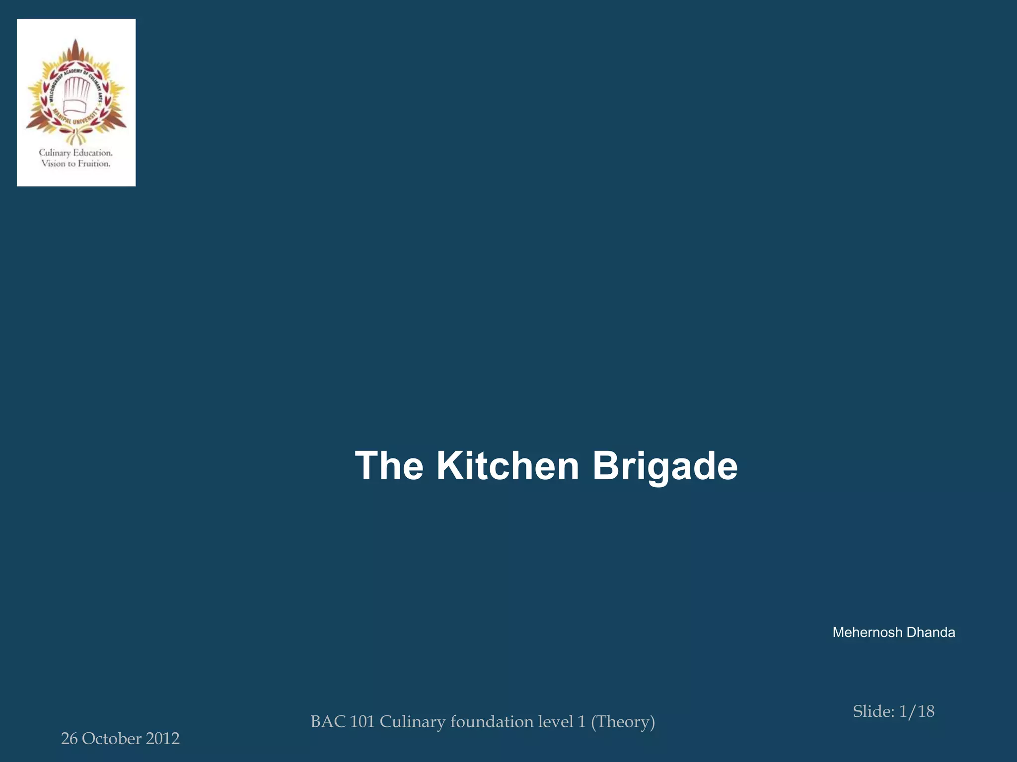 The document outlines the hierarchy and duties of staff in a professional kitchen brigade. It details the roles of the executive chef and sous chef at the top of the hierarchy who manage the kitchen. It then describes the various station chef and cooking roles for different food items down to apprentices and dishwashers at the bottom. Key positions include chef de partie for food stations, cuisinier as cooks, and commis as junior cooks.