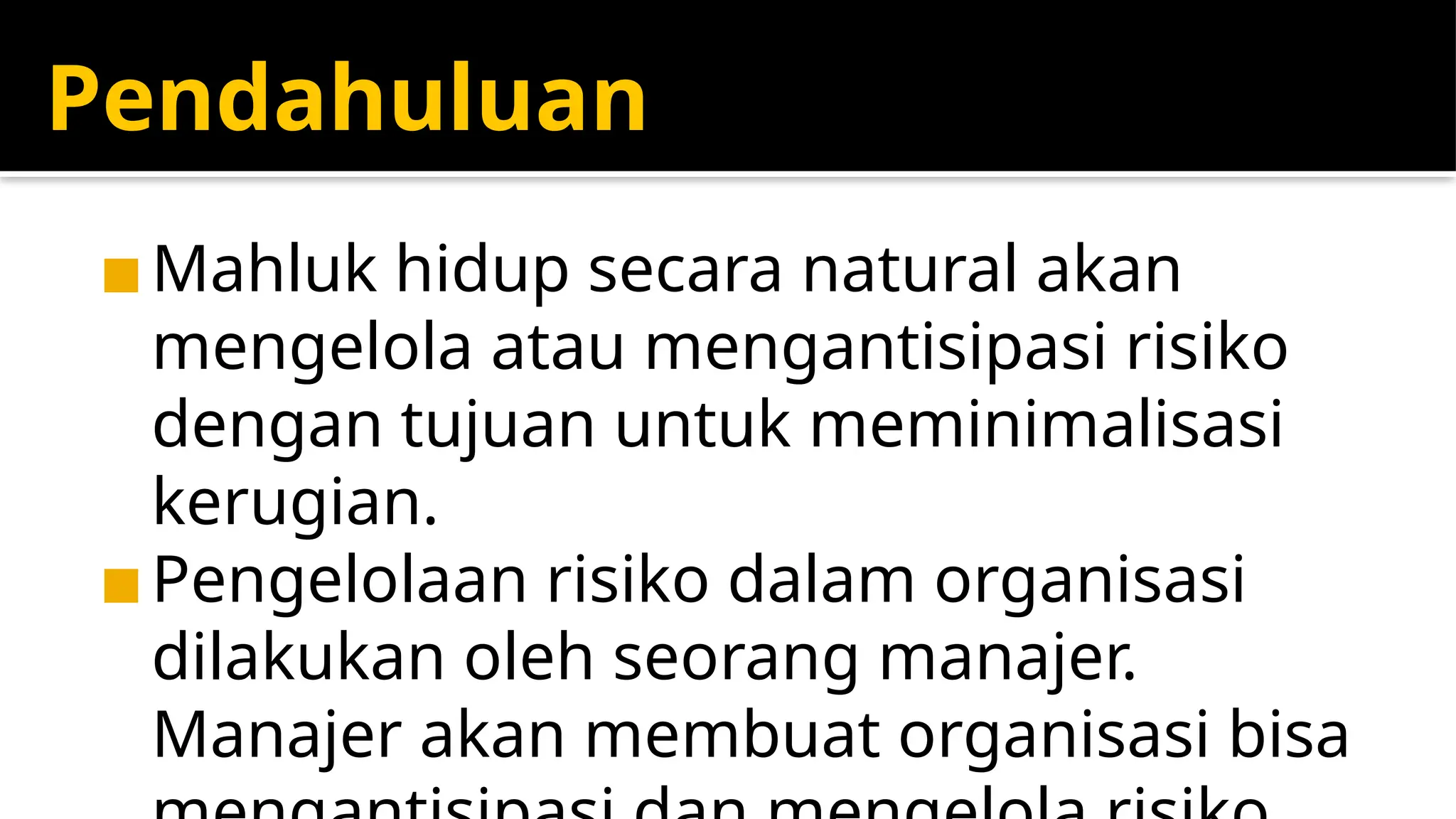Dokumen ini membahas pentingnya manajemen risiko dalam organisasi, dengan contoh kegagalan pengelolaan risiko yang mengakibatkan kerugian besar pada beberapa perusahaan. Manajemen risiko bertujuan untuk menciptakan sistem yang dapat mengidentifikasi, mengukur, dan mengendalikan risiko untuk meningkatkan nilai perusahaan. Pendekatan modern menekankan pengelolaan risiko yang komprehensif dan integratif dalam struktur organisasi.