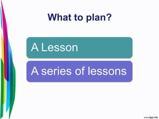 This document discusses lesson planning and its key components. It explains that lesson plans should include aims such as main aims describing the most important thing learners will achieve, subsidiary aims showing required prior skills or knowledge, and personal aims for teacher development. Stage aims describe the purpose of each lesson stage. Lesson plans also include procedures, timing, materials, target language, anticipated problems and solutions. Good lesson plans are relevant, include varied activities, are simple and clear, and are divided into background and procedure sections.