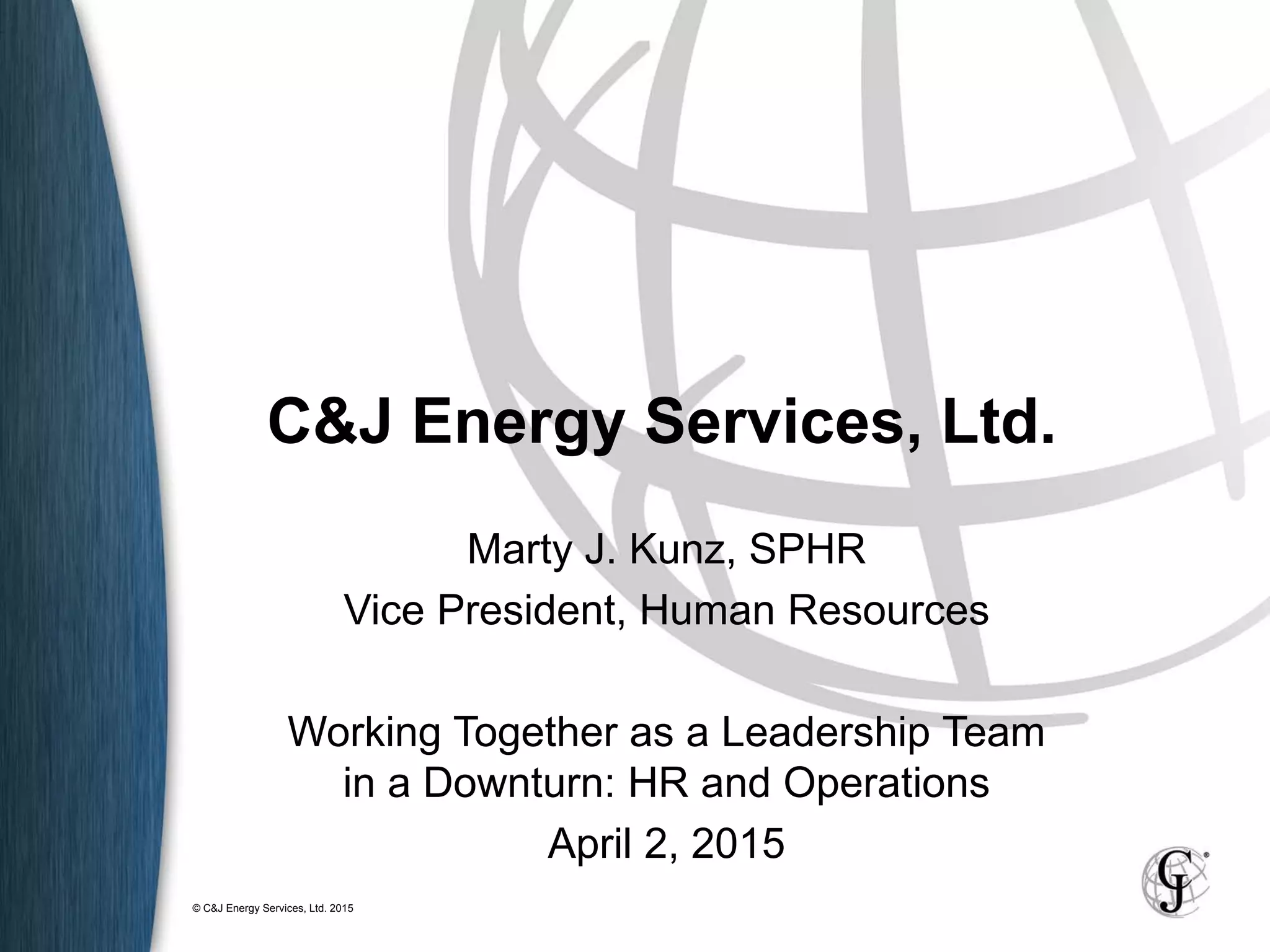 This document summarizes a presentation given by Marty Kunz, VP of HR at C&J Energy, about how HR and operations can work together during an economic downturn in the oil and gas industry. Kunz discusses three key areas of focus: 1) using downtime to strengthen training programs, 2) evaluating talent and career development opportunities, and 3) potentially "upgrading" staff by taking advantage of available talent in the current market. The full presentation provides additional context about C&J Energy, its history and services, and emphasizes how downturns can create opportunities to invest in employees and prepare for future growth.