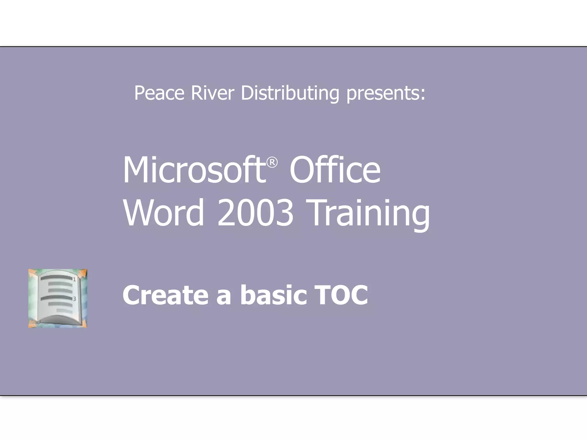 This document provides a training course on creating basic tables of contents (TOCs) in Microsoft Word 2003. It covers marking text with heading styles, outline levels, or custom styles to include in the TOC. It also describes formatting the TOC using built-in styles and updating the TOC. Practice questions are included to test the user's understanding.
