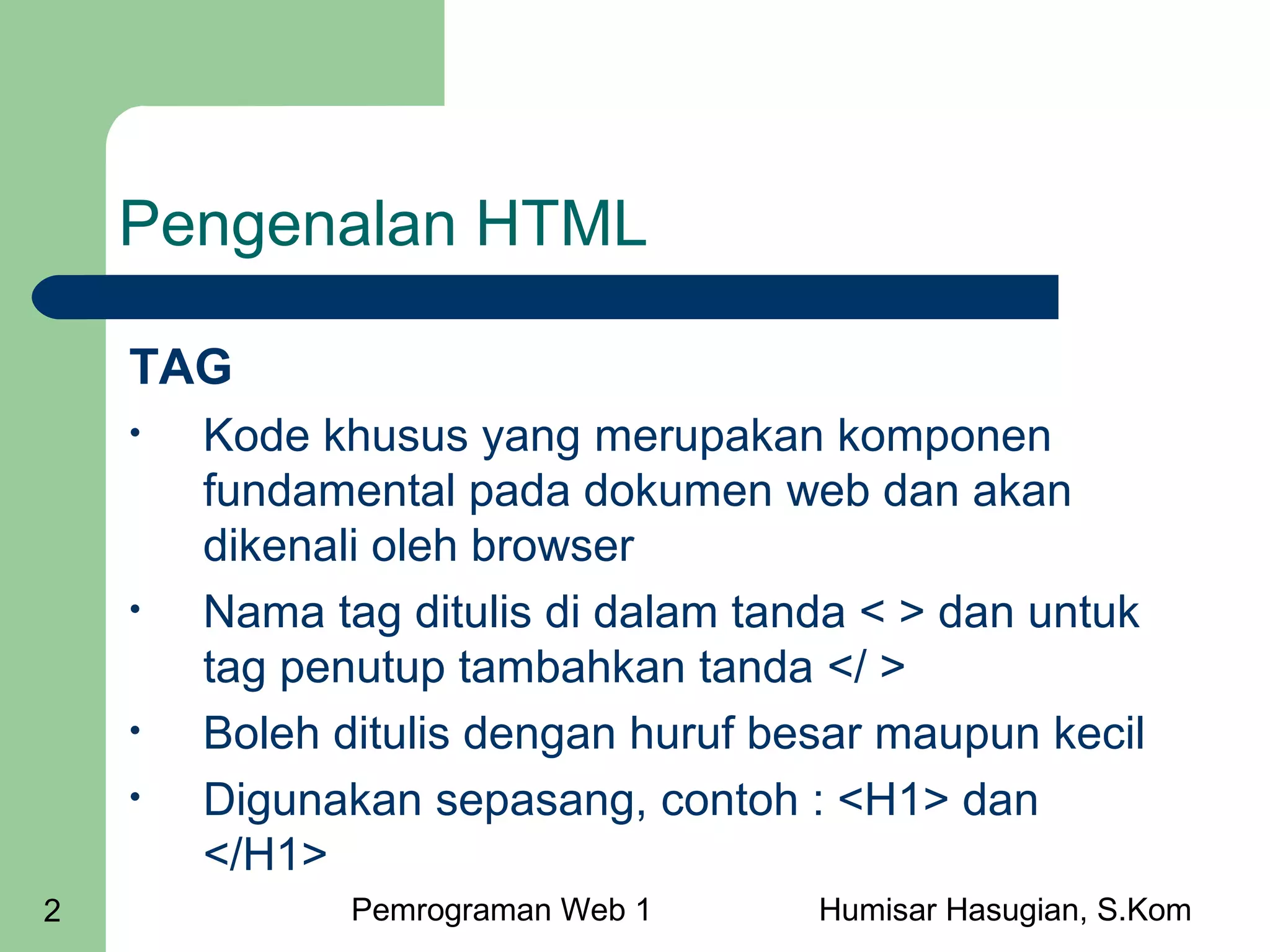 HTML merupakan bahasa standar untuk menampilkan dokumen web. Dokumen HTML terdiri dari tag-tag seperti <html>, <head>, <body> yang mendefinisikan struktur dasar dokumen. Tag-tag lain seperti <p>, <h1>-<h6> digunakan untuk paragraf dan judul, sedangkan <br> dan <hr> digunakan untuk line break dan garis horizontal.